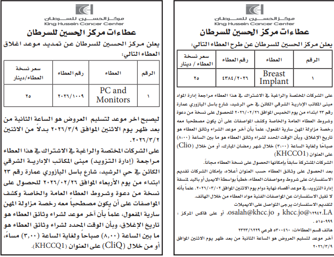 عطاءات صادرة عن مركز الحسين للسرطان