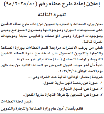 عطاء التأمين على مستودعات وزارة الصناعة والتجارة والتموين