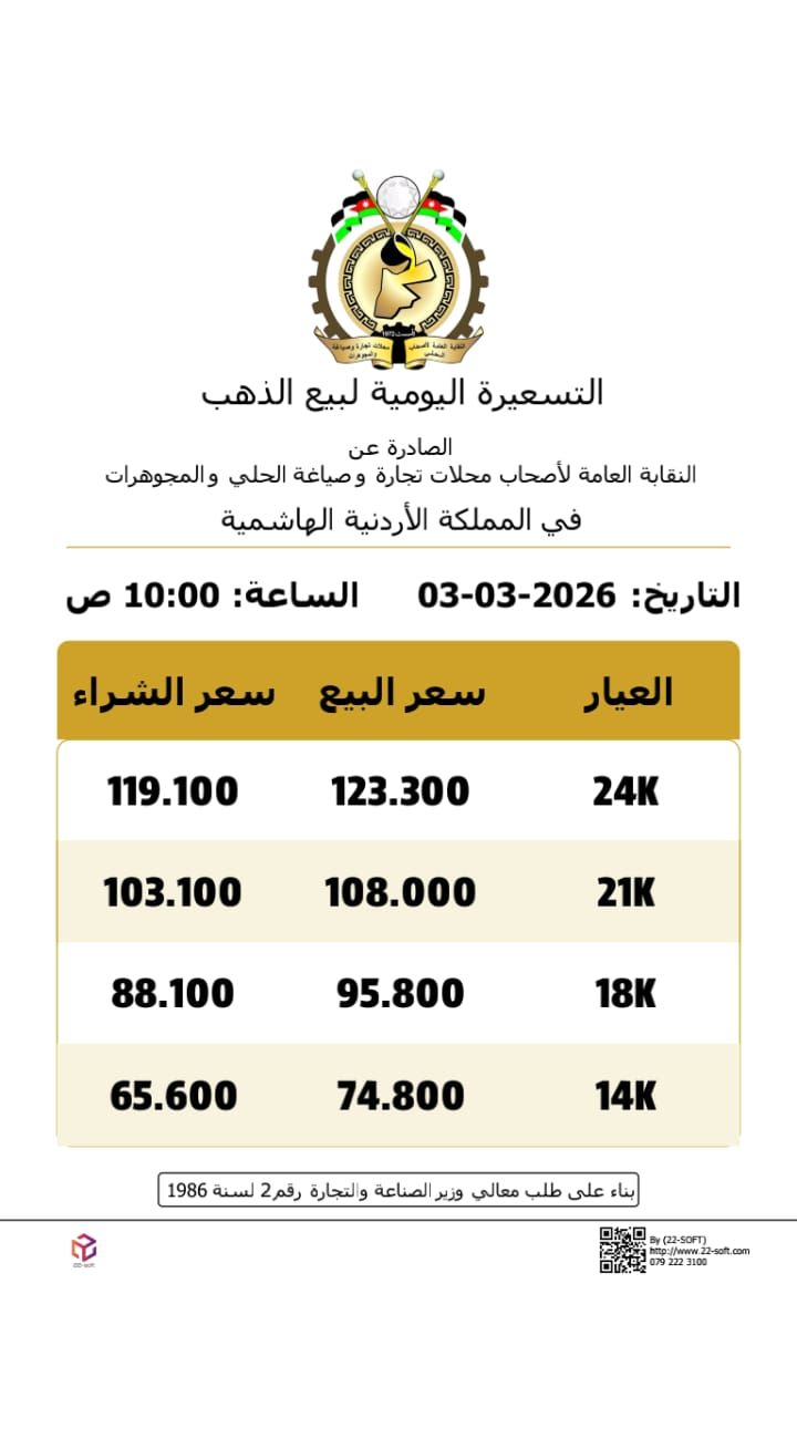 أسعار الذهب في الأردن الثلاثاء03-03-2026 11:19 AM
