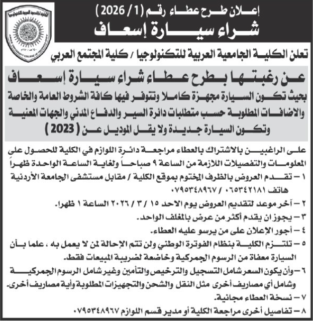 عطاء شراء سيارة اسعاف