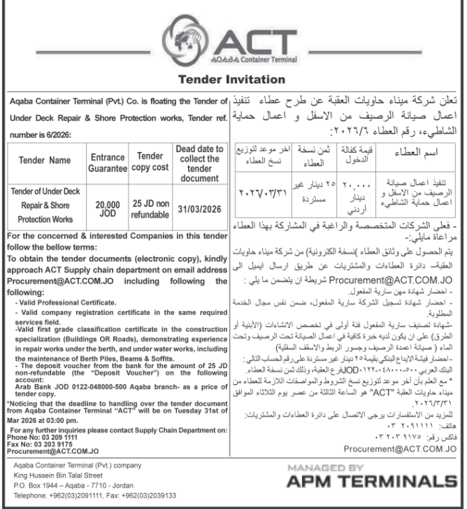 عطاء صادر عن شركة حاويات ميناء العقبة