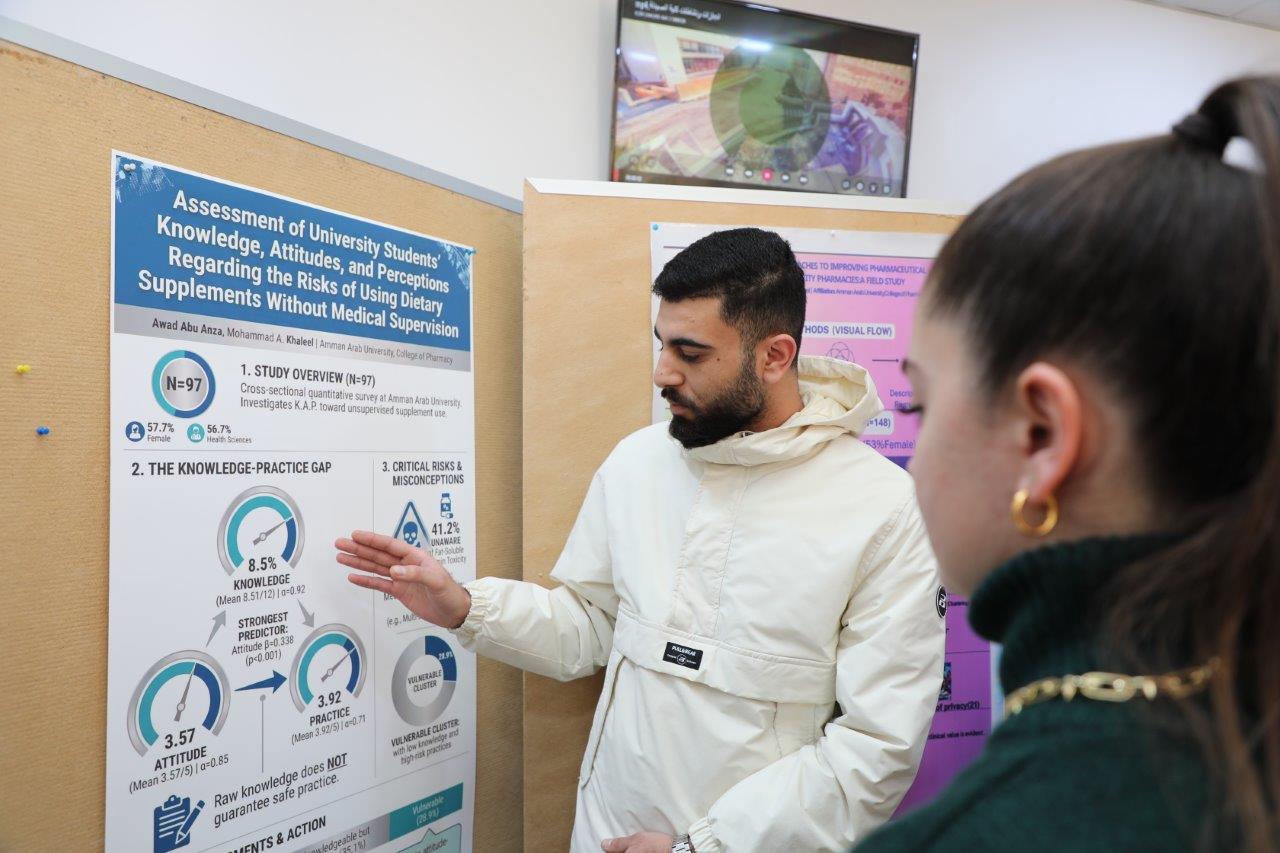 وجاءت هذه الفعالية ضمن مساق "مشروع بحث" بإشراف الدكتور محمد خليل، وبالتزامن مع أنشطة مساق "ممارسة صيدلة" بإشراف الدكتورة لبنى الغرايبة، حيث هدفت إلى إتاحة الفرصة للطلبة لعرض نتاجاتهم البحثية وتبادل الخبرات العلمية في بيئة أكاديمية محفزة على الابتكار والتفكير النقدي، حيث تناول العرض موضوعات بحثية تطبيقية متنوعة في مجالات الصيدلة السريرية، وسلامة ومأمونية الدواء، والممارسة الصيدلانية المجتمعية، وعكست المشاريع قدرة الطلبة على تحديد المشكلات الصحية ذات الأولوية، وصياغة أسئلة بحثية دقيقة واختيار المنهجيات المناسبة لجمع البيانات وتحليلها، وصولًا إلى استخلاص نتائج مدعومة بالأدلة العلمية.