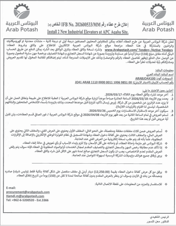 عطاء صادر عن شركة البوتاس العربية