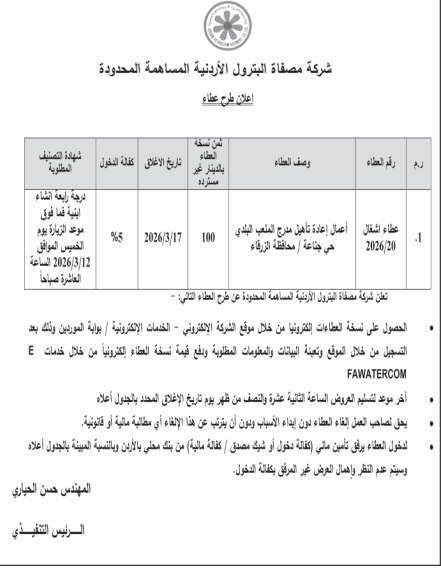 عطاء صادر عن شركة مصفاة البترول