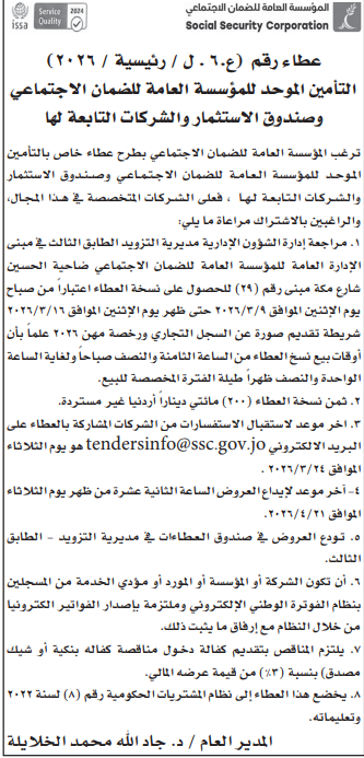 عطاءات صادرة عن المؤسسة العامة للضمان الاجتماعي