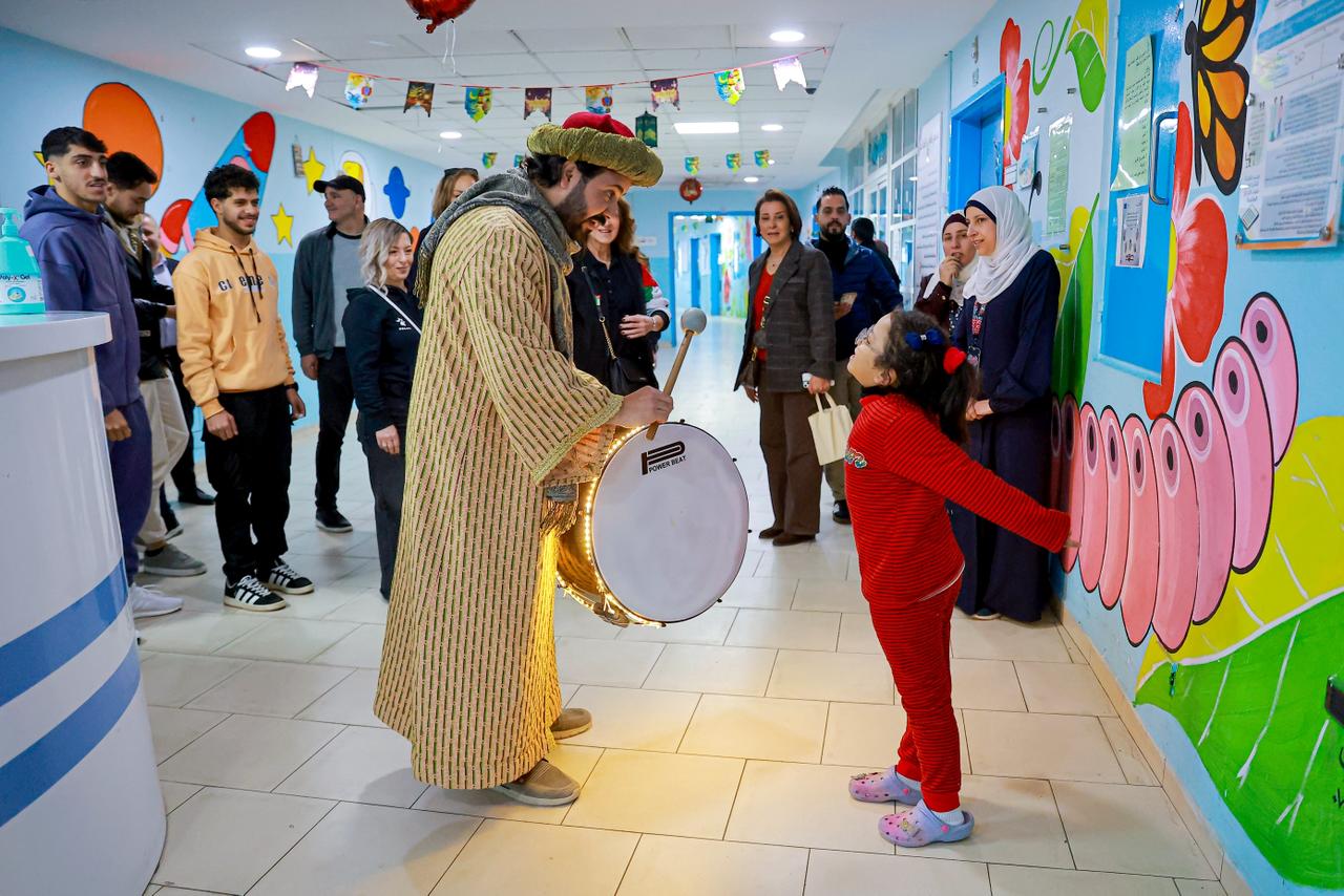 مؤيد سليم، ديانا الدلو، لبنى كرادشة وروجينا سليمان و عثمان الحسنات بالتجول داخل القسم وزيارة غرف المرضى والحديث معهم والتقاط الصور التذكارية مع الأطفال الذين كانوا في غاية السعادة.