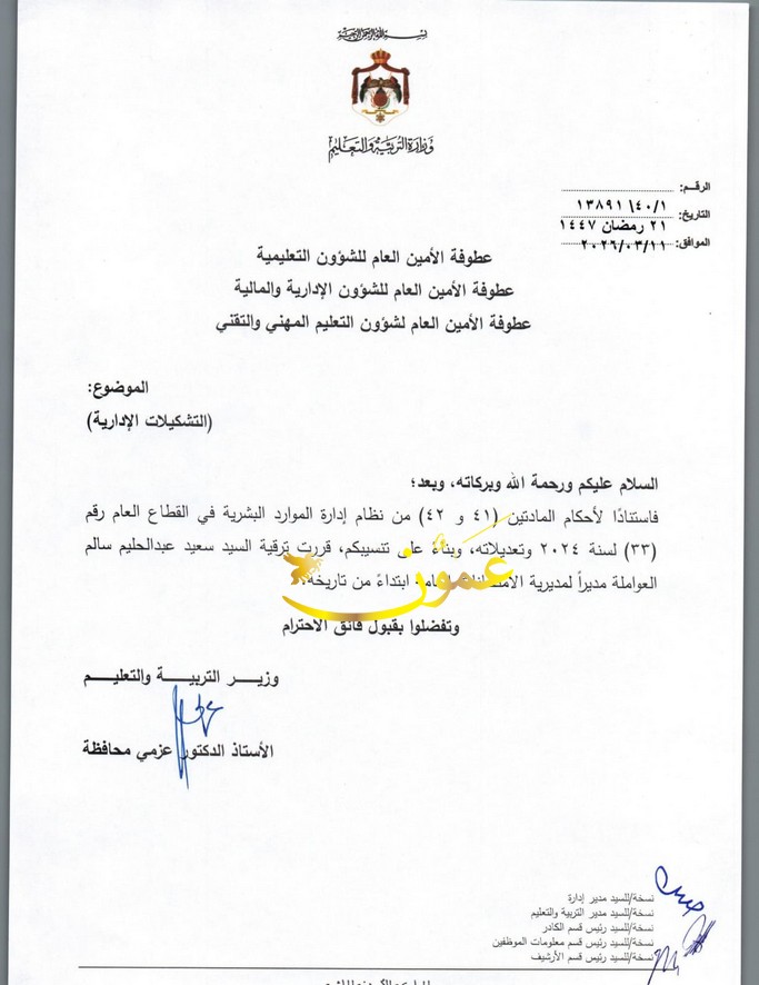عمون - قرر وزير التربية والتعليم الدكتور عزمي محافظة ترقية سعيد عبدالحليم سالم العواملة ليكون مديرًا لمديرية الامتحانات العامة في الوزارة. |