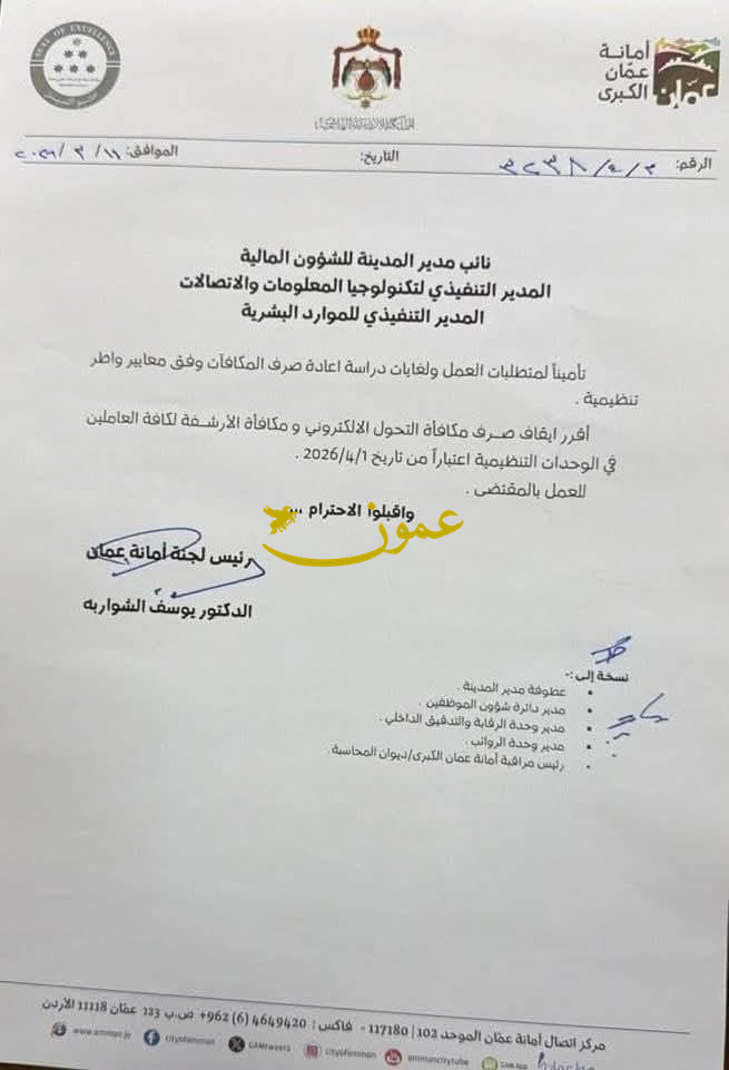 أمانة عمّان توقف مكافآت التحول الإلكتروني والارشفة14-03-2026 02:56 AM