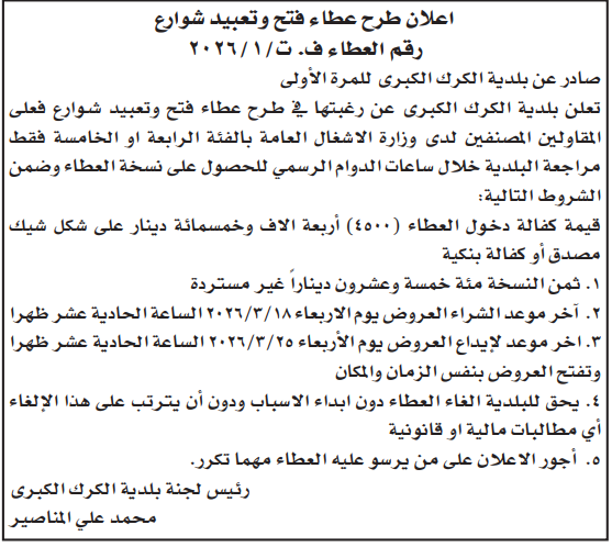 عطاء فتح وتعبيد شوارع بلدية الكرك