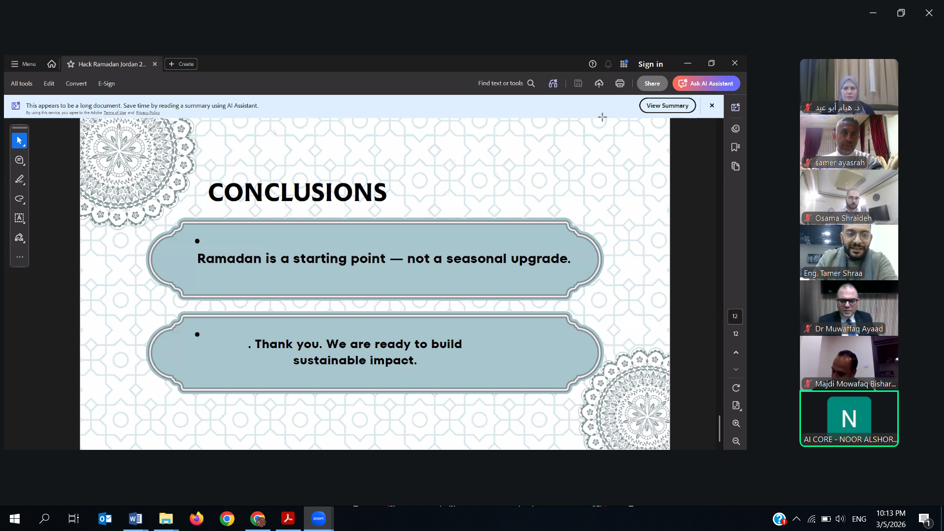 وتأتي مشاركة الدكتور العياصرة في لجنة التحكيم انطلاقًا من حرص مركز الإبداع والابتكار وريادة الأعمال في جامعة عمان العربية على توسيع آفاق التعاون مع المؤسسات التعليمية، وتعزيز الشراكات الداعمة لبيئة الابتكار وريادة الأعمال، إضافة إلى دعم المبادرات التي تسهم في صقل مهارات الطلبة والشباب وتمكينهم من تطوير أفكارهم الريادية وتحويلها إلى مشاريع قابلة للتطبيق، حيث يهدف الهاكثون الى نشر ثقافة الريادة بين طلبة الجامعات الأردنية، وتعزيز قدراتهم على تحويل أفكارهم الإبداعية إلى نماذج أولية للمشاريع (MVPs)، بما يسهم في تقديم حلول مبتكرة لمعالجة تحديات واقعية، لا سيما التحديات المجتمعية المرتبطة بشهر رمضان المبارك.
