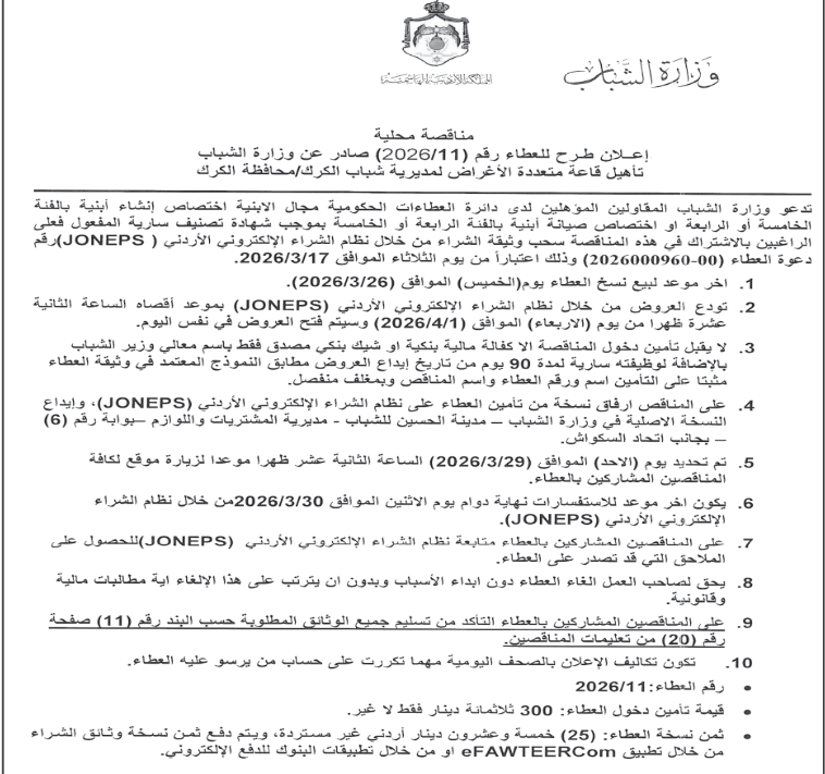 عطاء اعادة تأهيل صالة متعددة الاغراض لمديرية شباب الكرك
