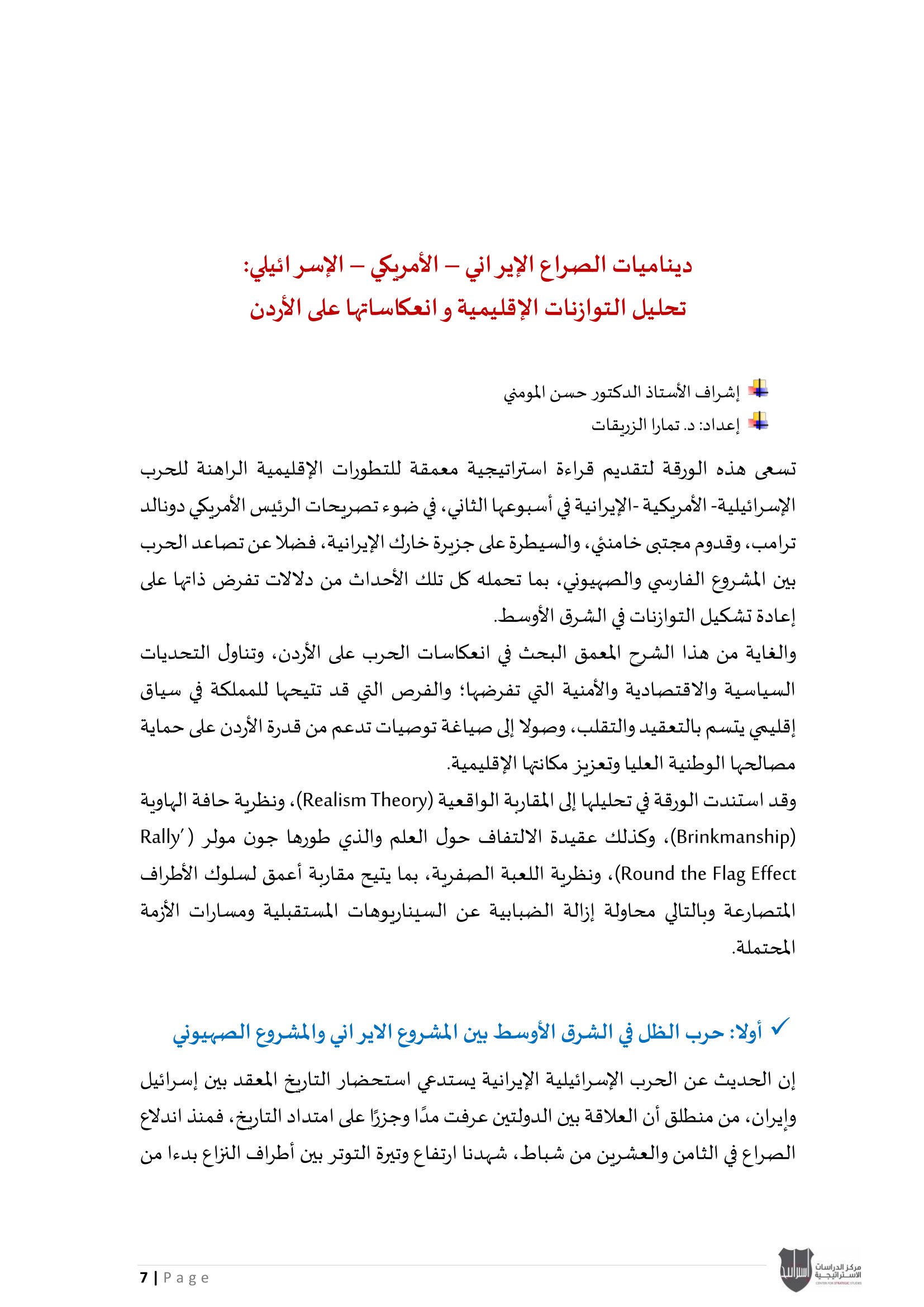 • ديناميات الصراع الإيراني – الأمريكي – الإسرائيلي: تحليل التوازنات الإقليمية وانعكاساتها على الأردن.