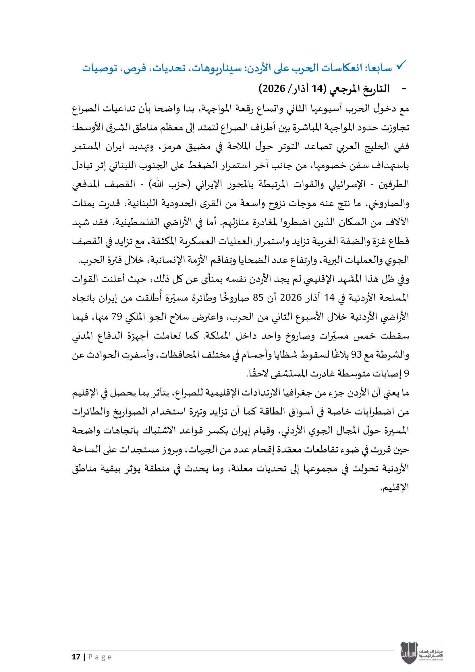 ويأتي هذا التقرير في ظل تحولات غير مسبوقة تشهدها المنطقة منذ أكثر من أسبوعين على اندلاع الحرب، حيث تتسارع وتيرة التصعيد العسكري، وتتزايد حالة عدم اليقين بشأن مآلات الصراع، في ظل تداخل المصالح الإقليمية والدولية، واتساع نطاق التأثيرات الأمنية والاقتصادية والسياسية على دول المنطقة.