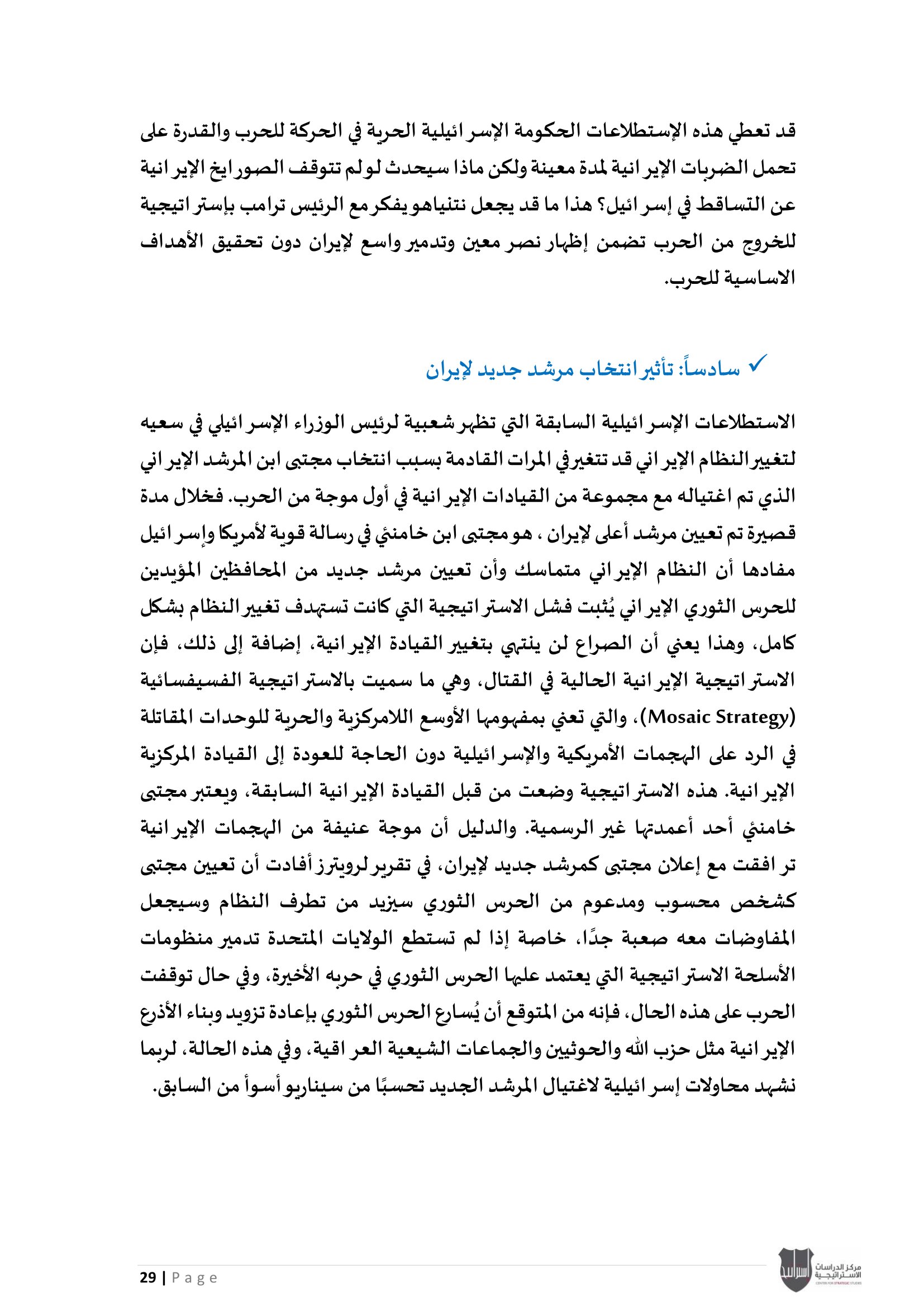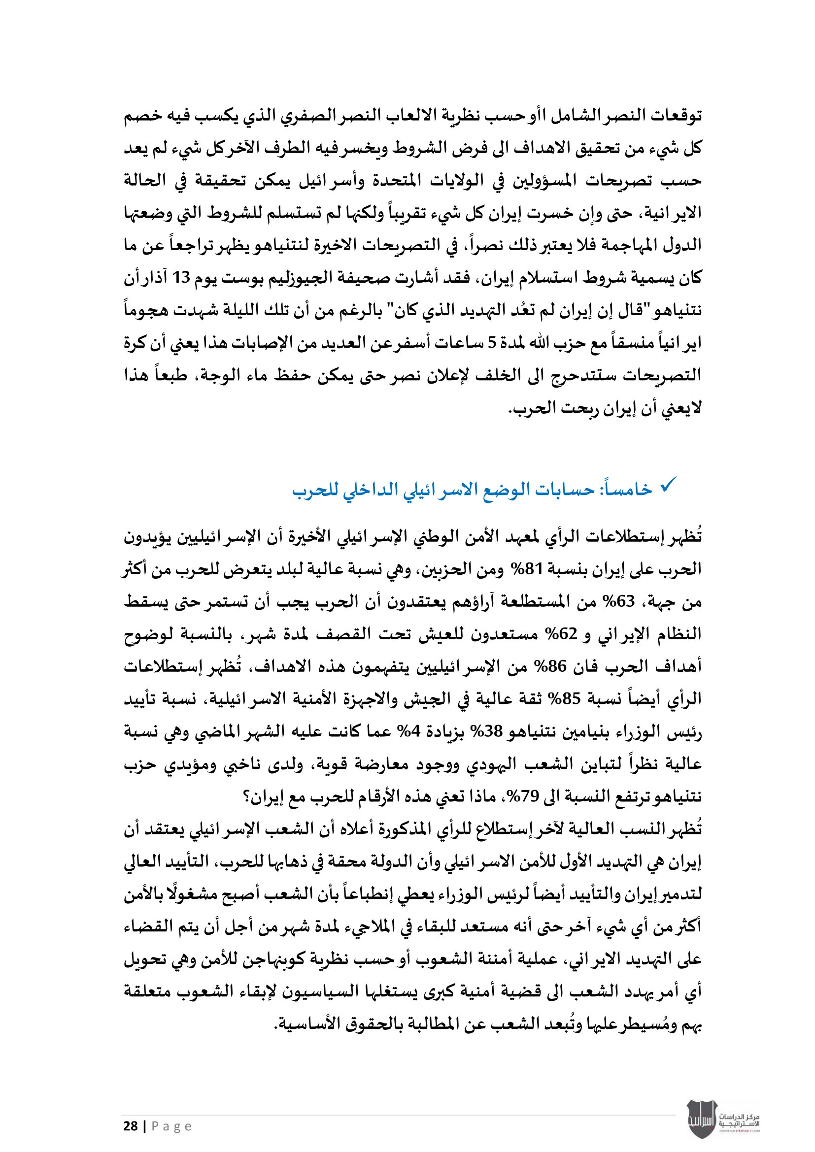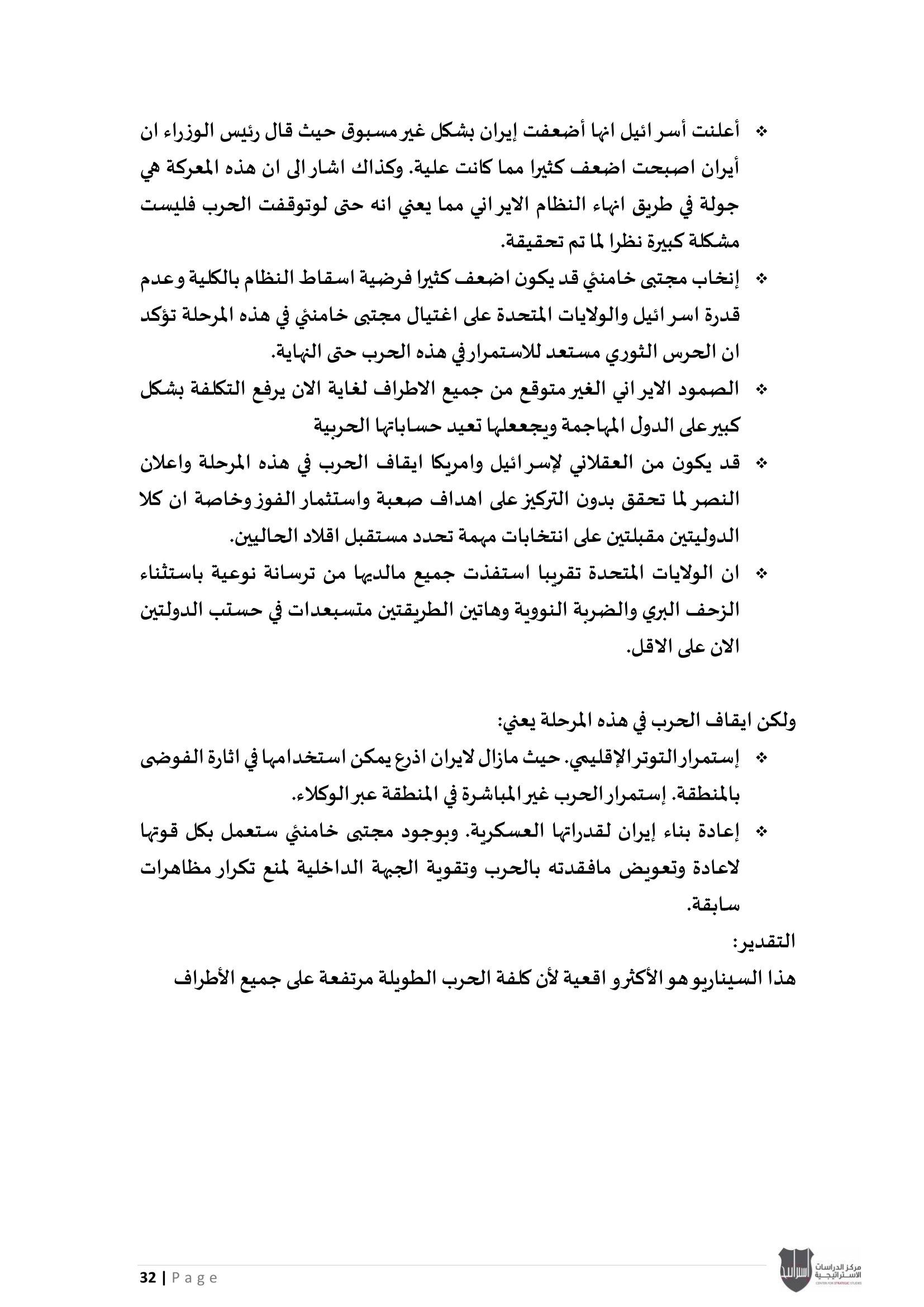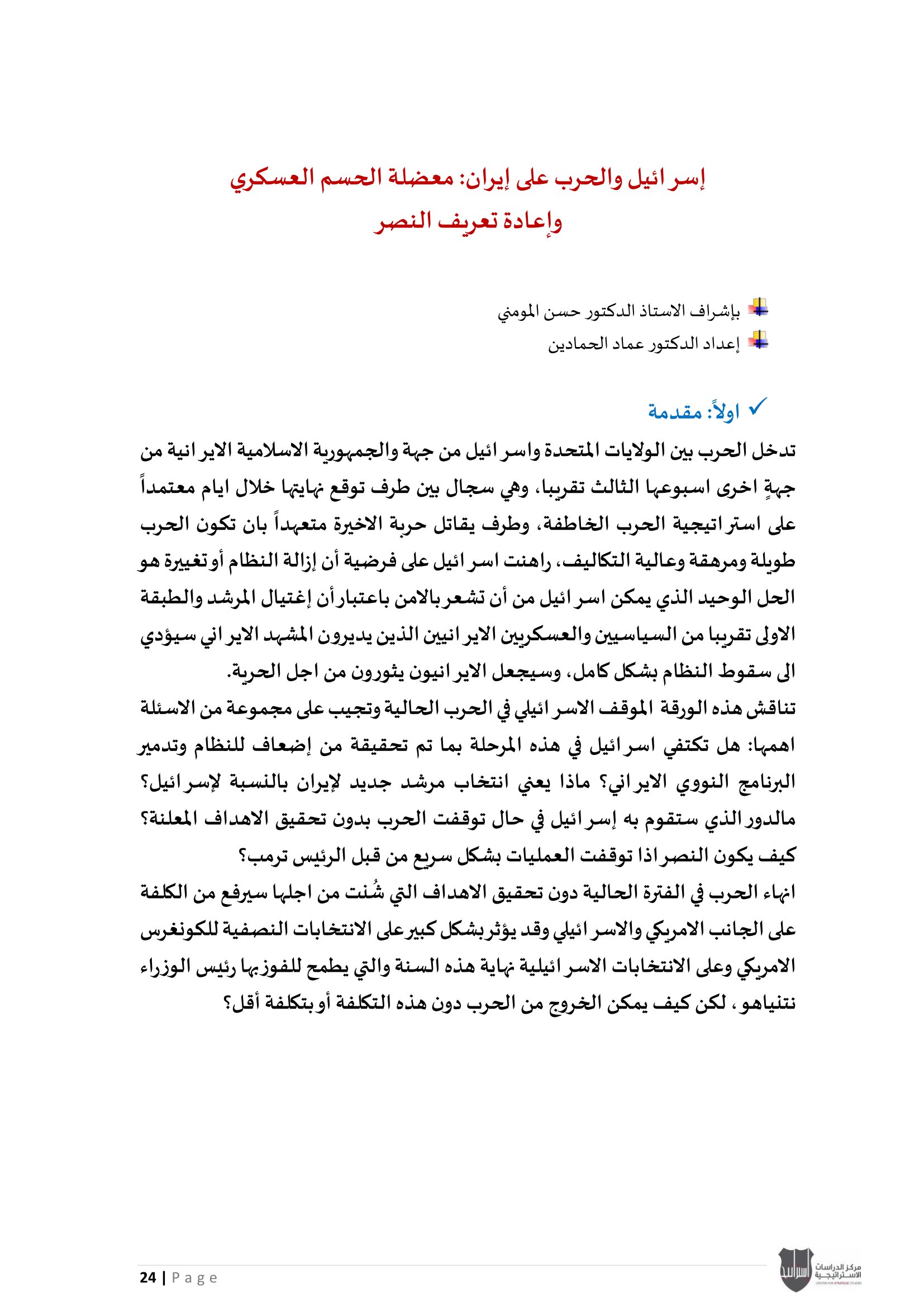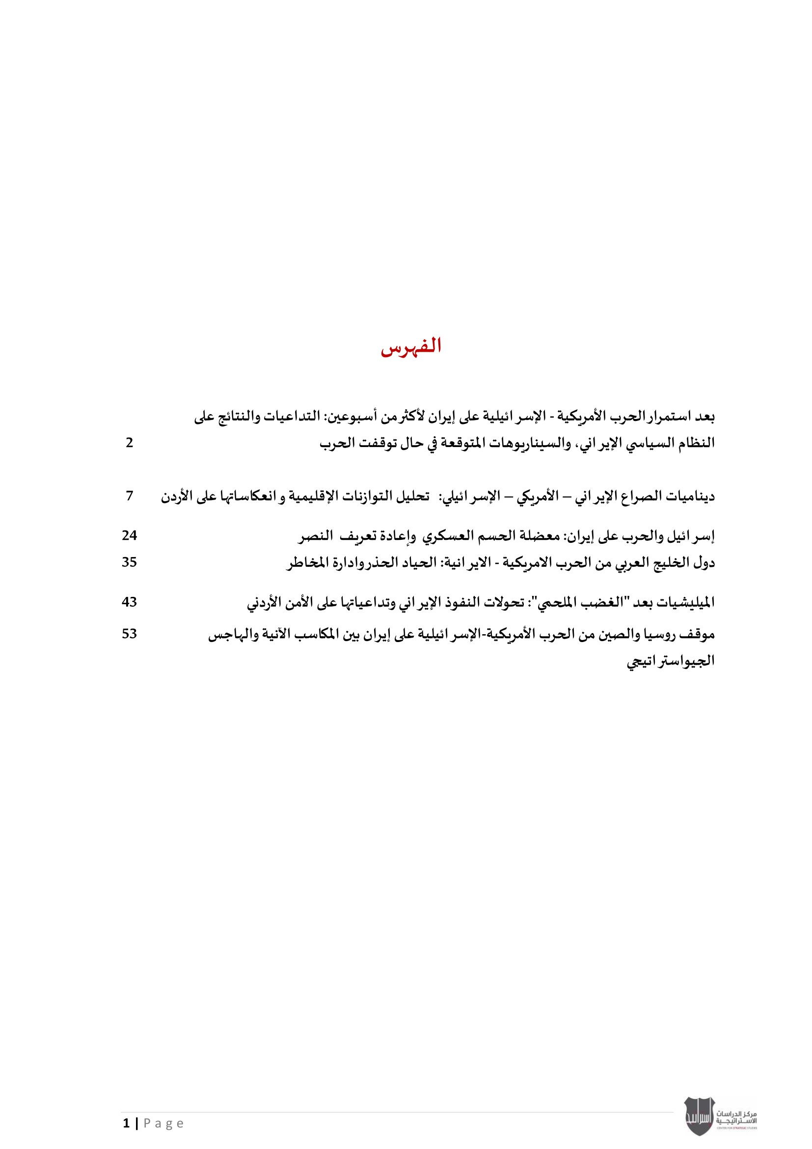 • إسرائيل والحرب على إيران: معضلة الحسم العسكري وإعادة تعريف النصر، إلى جانب تحليل موقف دول الخليج العربي من الحرب الأمريكية - الإيرانية بين الحياد الحذر وإدارة المخاطر.