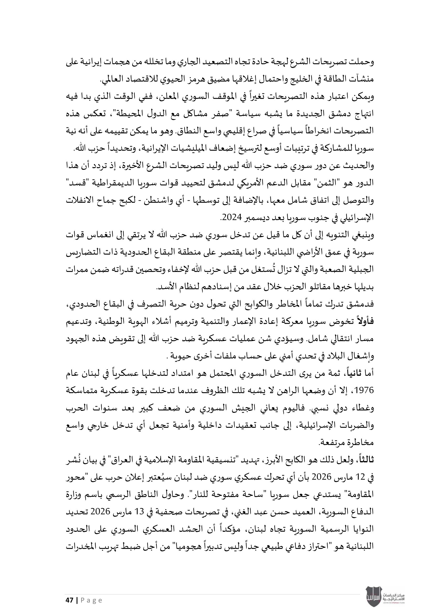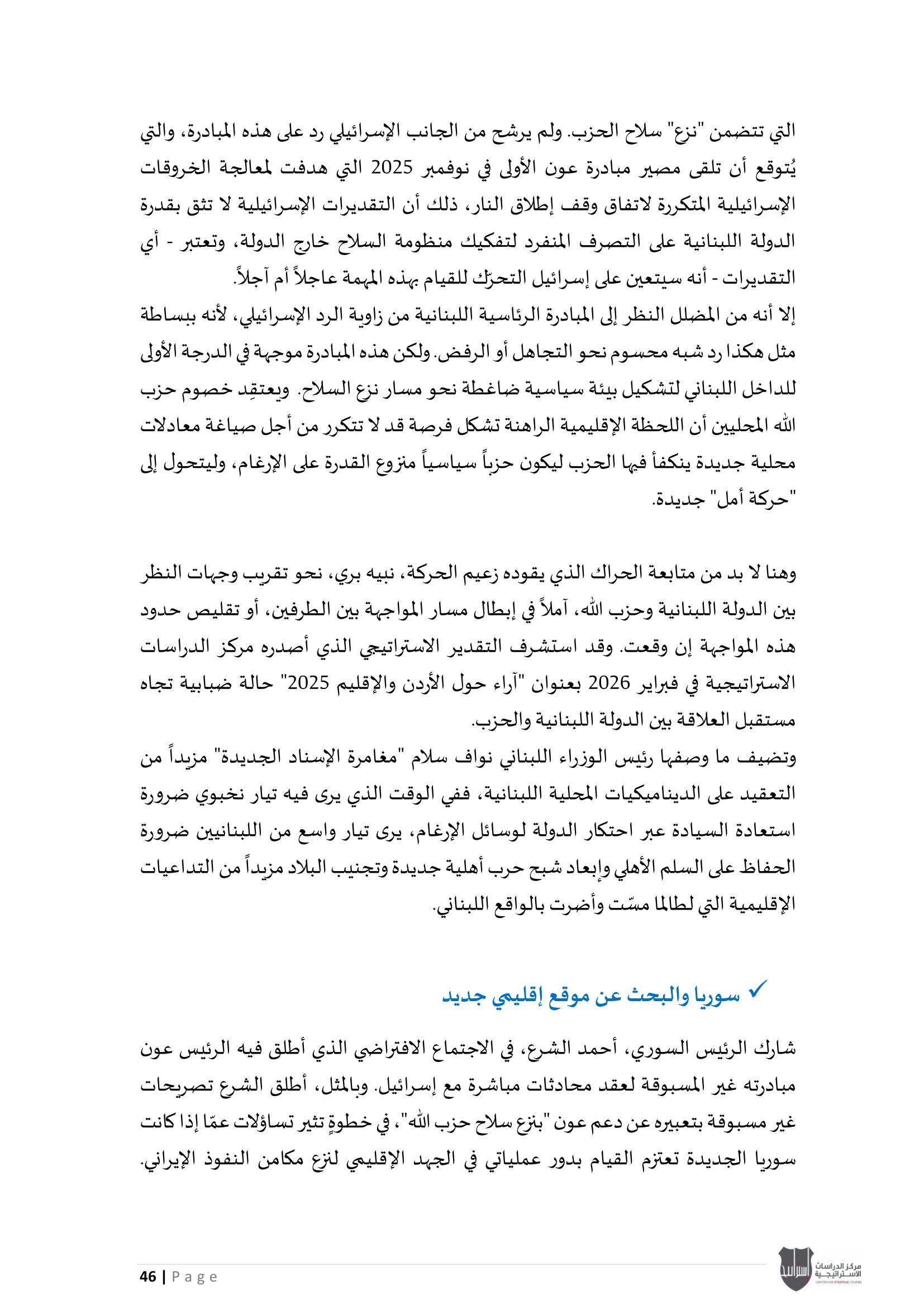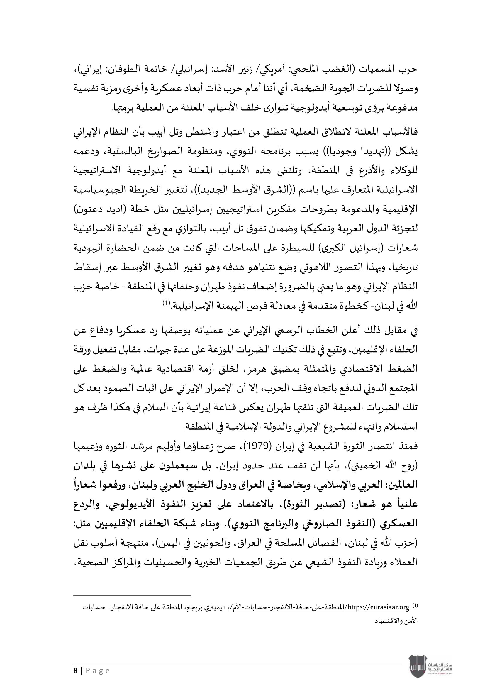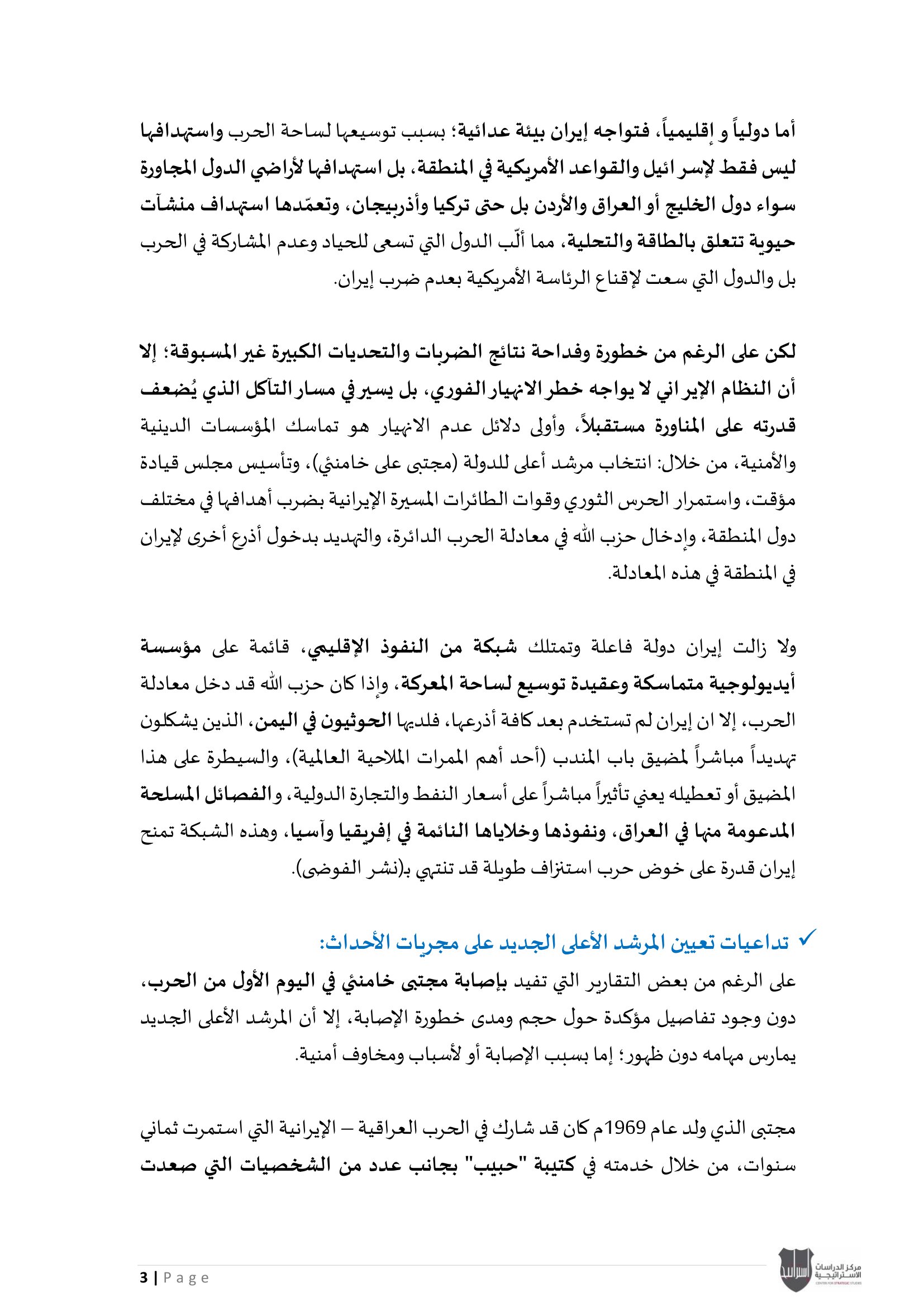 ويؤكد المركز أن هذا الإصدار يندرج ضمن سلسلة تقاريره الدورية التي تهدف إلى تقديم قراءة استراتيجية معمّقة، تسهم في استشراف الاتجاهات الكبرى في الإقليم، ودعم عملية صنع القرار من خلال تحليل علمي رصين يستند إلى متابعة دقيقة لمجريات الأحداث وتداعياتها المحتملة.