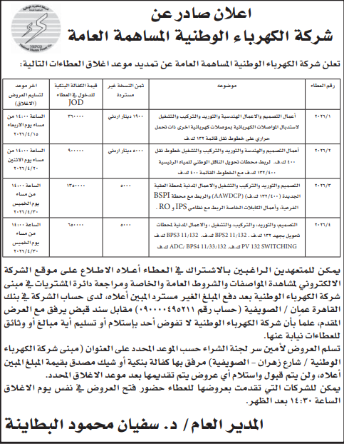 عطاءات صادرة عن شركة الكهرباء الوطنية