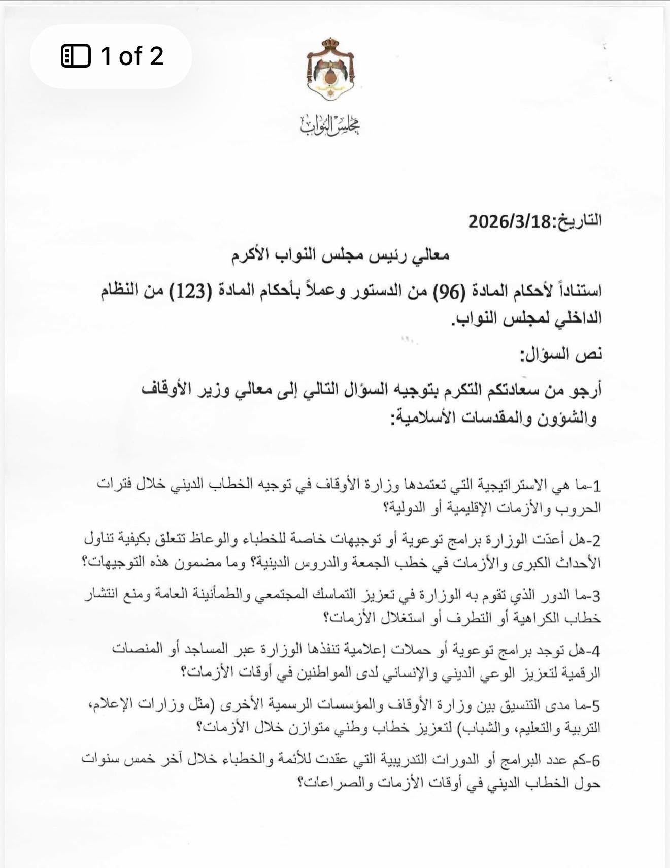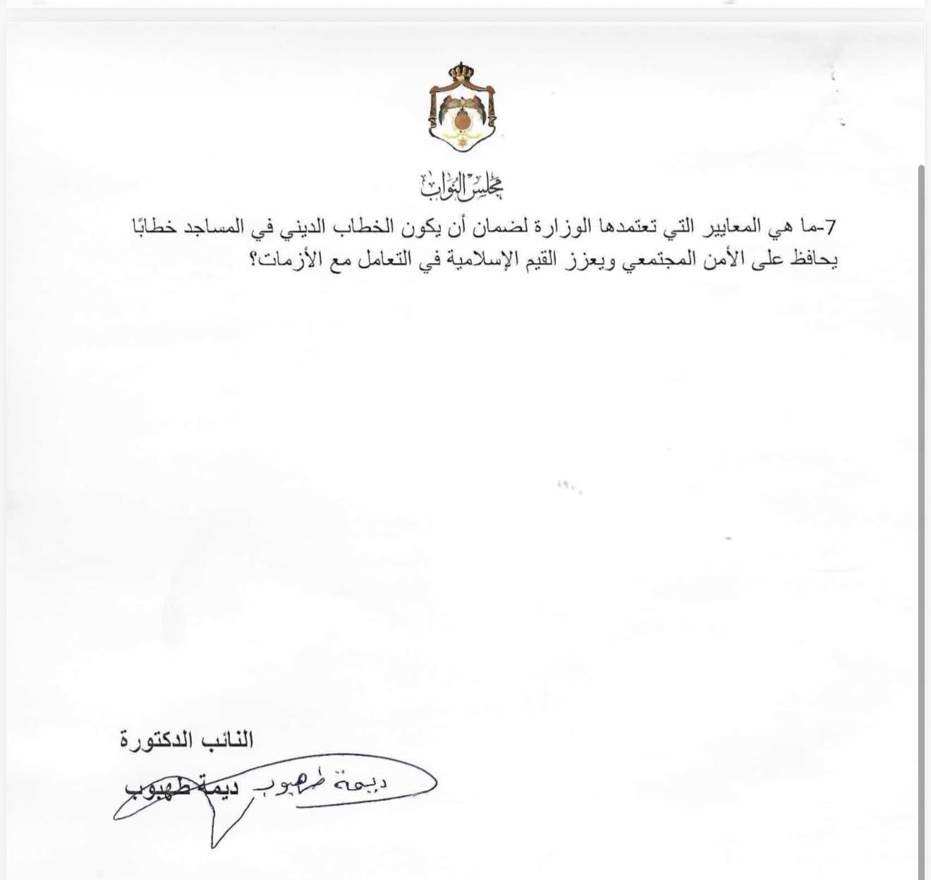 عمون - وجّهت النائب ديمة طهبوب سؤالًا إلى وزارة الأوقاف حول دورها في ترسيخ الوعي الديني والأخلاقي خلال فترات الأزمات والحروب، مؤكدةً أهمية الأمن الديني والأخلاقي في تعزيز منعة المجتمع.