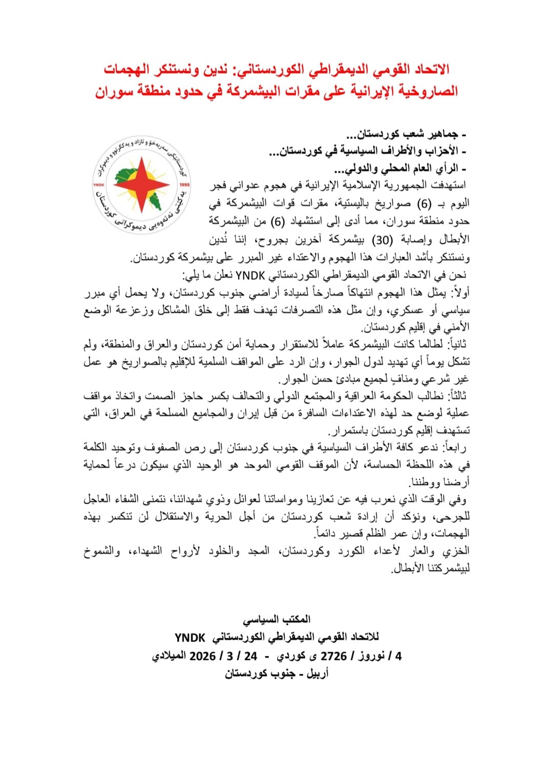 وقال الاتحاد في بيان، إن "الجمهورية الإسلامية الإيرانية نفذت هجوماً عدوانياً باستخدام 6 صواريخ باليستية استهدفت مقرات البيشمركة في حدود منطقة سوران"، ما أسفر عن مقتل 6 عناصر من القوات وإصابة 30 آخرين.