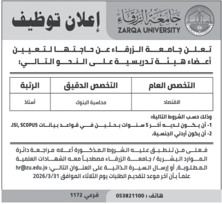 جامعة الزرقاء بحاجة لتعيين أعضاء هيئة تدريسية