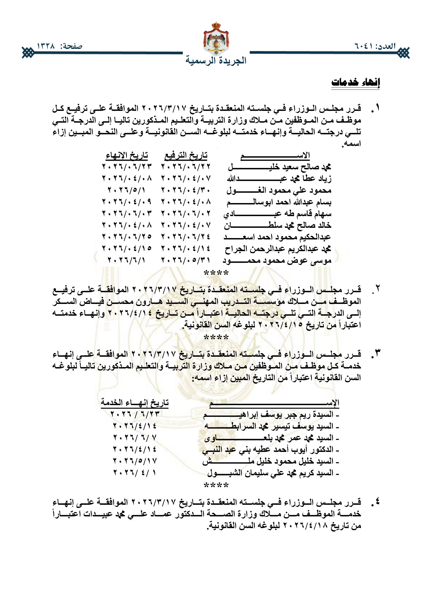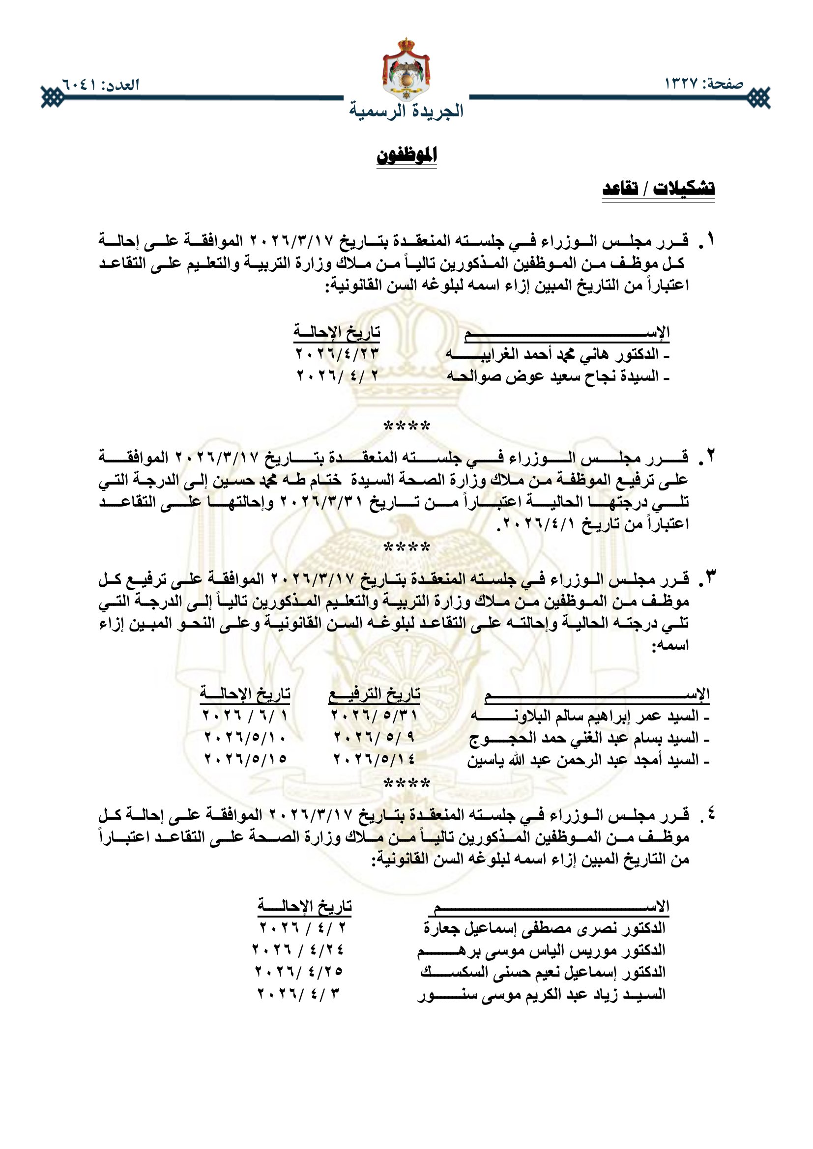 عمون - صدر في عدد الجريدة الرسمية اليوم الخميس، قرارات مجلس الوزراء باحالة عدد من موظفي الحكومة إلى التقاعد.