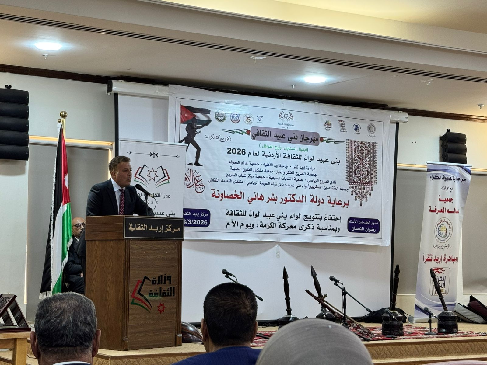 وأكد أبو زريق، خلال كلمته، أن هذا المهرجان يُشكّل منصة وطنية جامعة تحتفي بالثقافة بوصفها ركيزة أساسية في بناء المجتمعات، مشيرًا إلى أهمية هذه الفعاليات في تعزيز الوعي الثقافي وربط الأجيال بتراثهم الوطني، كما أشار إلى أن اختيار لواء بني عبيد لواءً للثقافة الأردنية لعام 2026 يُعد تتويجًا لمسيرته الغنية بالعطاء الثقافي والإنساني.