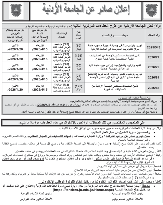 عطاءات صادرة عن الجامعة الاردنية