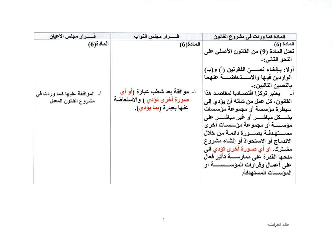 ورفض مجلس الأعيان قرار "النواب" بشطب عبارة "أي مُمارسات" من المادة 3 من مشروع القانون، والمُتعلقة بالمُمارسات المُخلة بالمُنافسة، حيث قرر "الأعيان": "شطب البند أولا (المُضاف من مجلس النواب والإبقاء على نص المادة كما وردت في مشروع القانون المعدل".