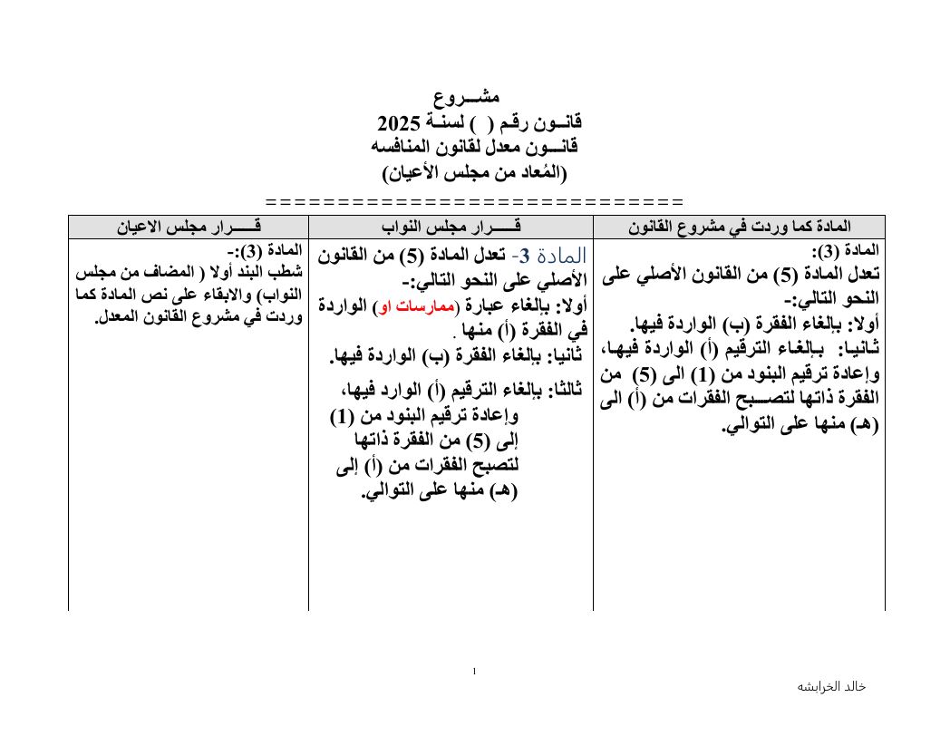 وكان مجلس الأعيان أعاد خلال جلسة عقدها في 15 شباط الماضي، مشروع قانون مُعدل لقانون المُنافسة لسنة 2025.