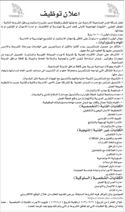 وظيفة شاغرة لدى شركة المدن الصناعية