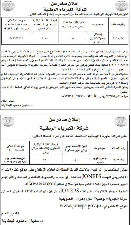 عطاءات صادرة عن شركة الكهرباء الوطنية