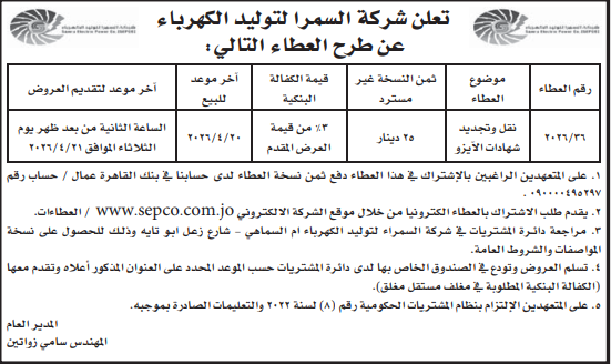 عطاء صادر عن شركة السمرا لتوليد الكهرباء
