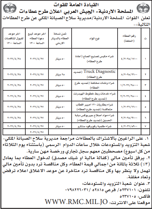 عطاءات صادرة عن القيادة العامة للقوت المسلحة الاردنية