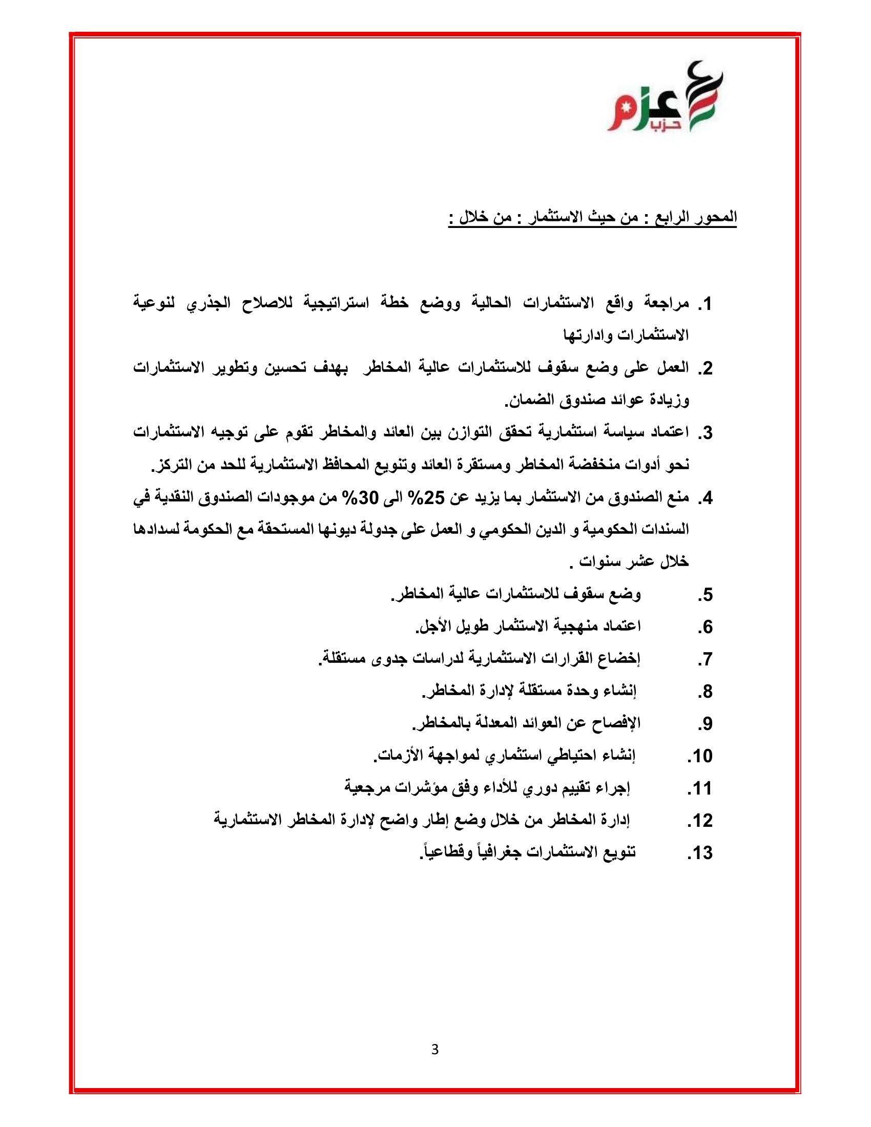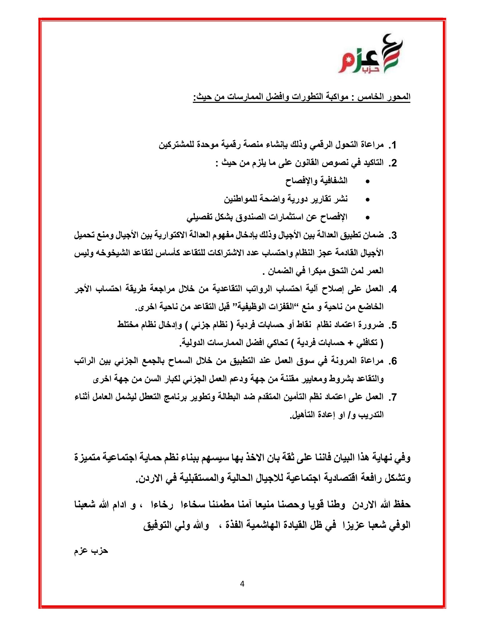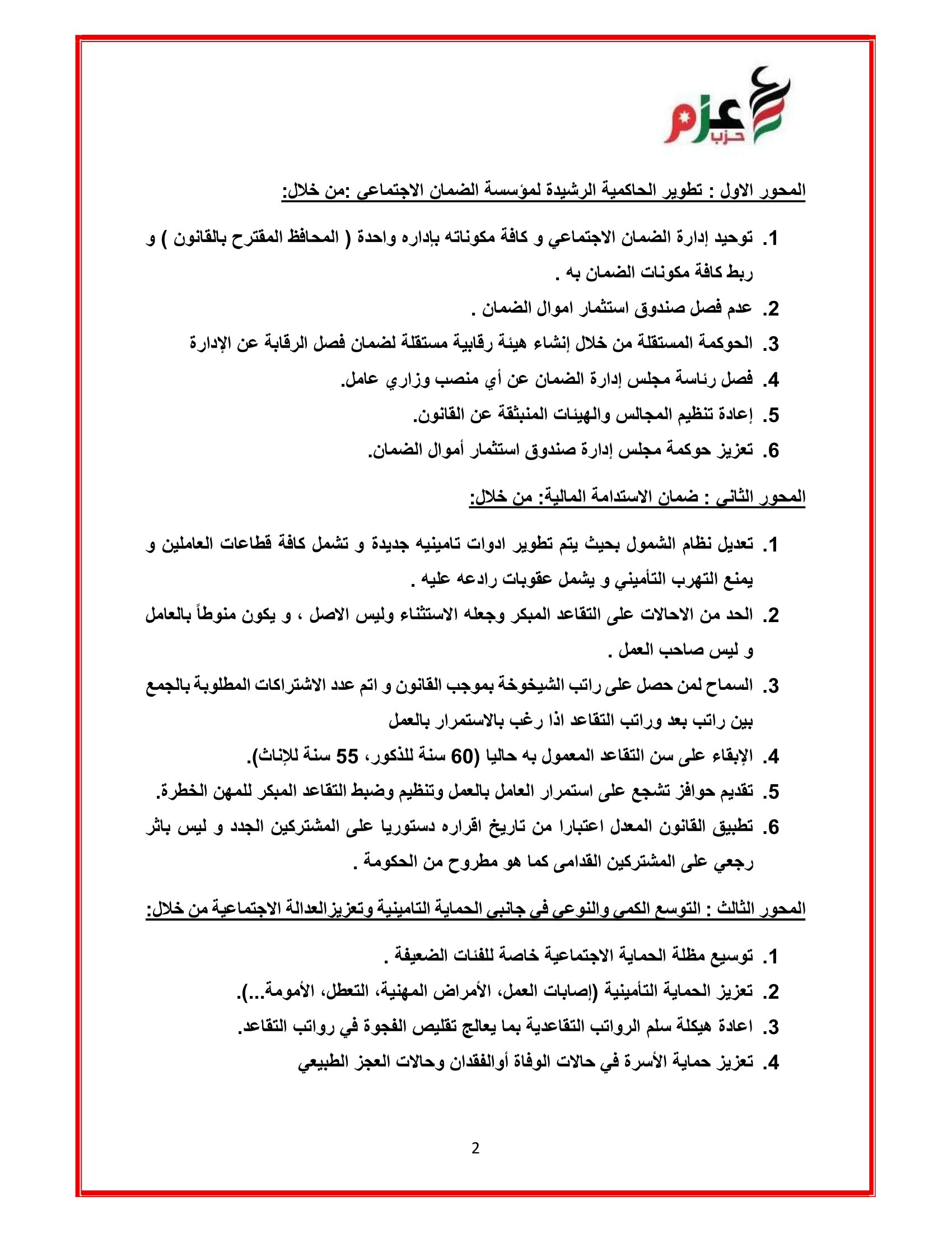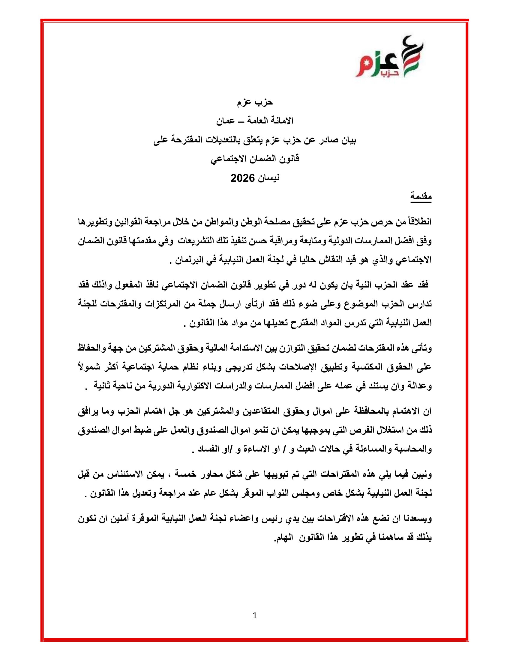 عمون - شكل حزب عزم فريقا من اصحاب الاختصاص ونواب كتلة حزب عزم النيابية للاجتماع عند الساعة الثانية بعد الظهر بلجنة العمل النيابية لبحث التعديلات على قانون الضمان الاجتماعي. |