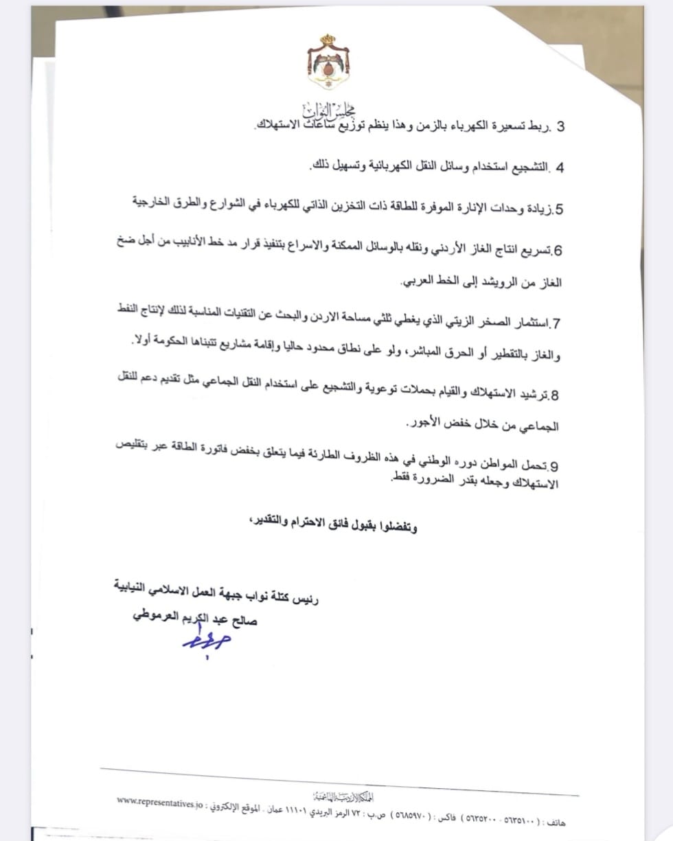 كما دعت إلى تسريع إنتاج الغاز الأردني ومد خطوط الأنابيب اللازمة، واستثمار الصخر الزيتي عبر تقنيات حديثة، فضلًا عن إطلاق حملات وطنية لترشيد الاستهلاك ودعم النقل العام.
