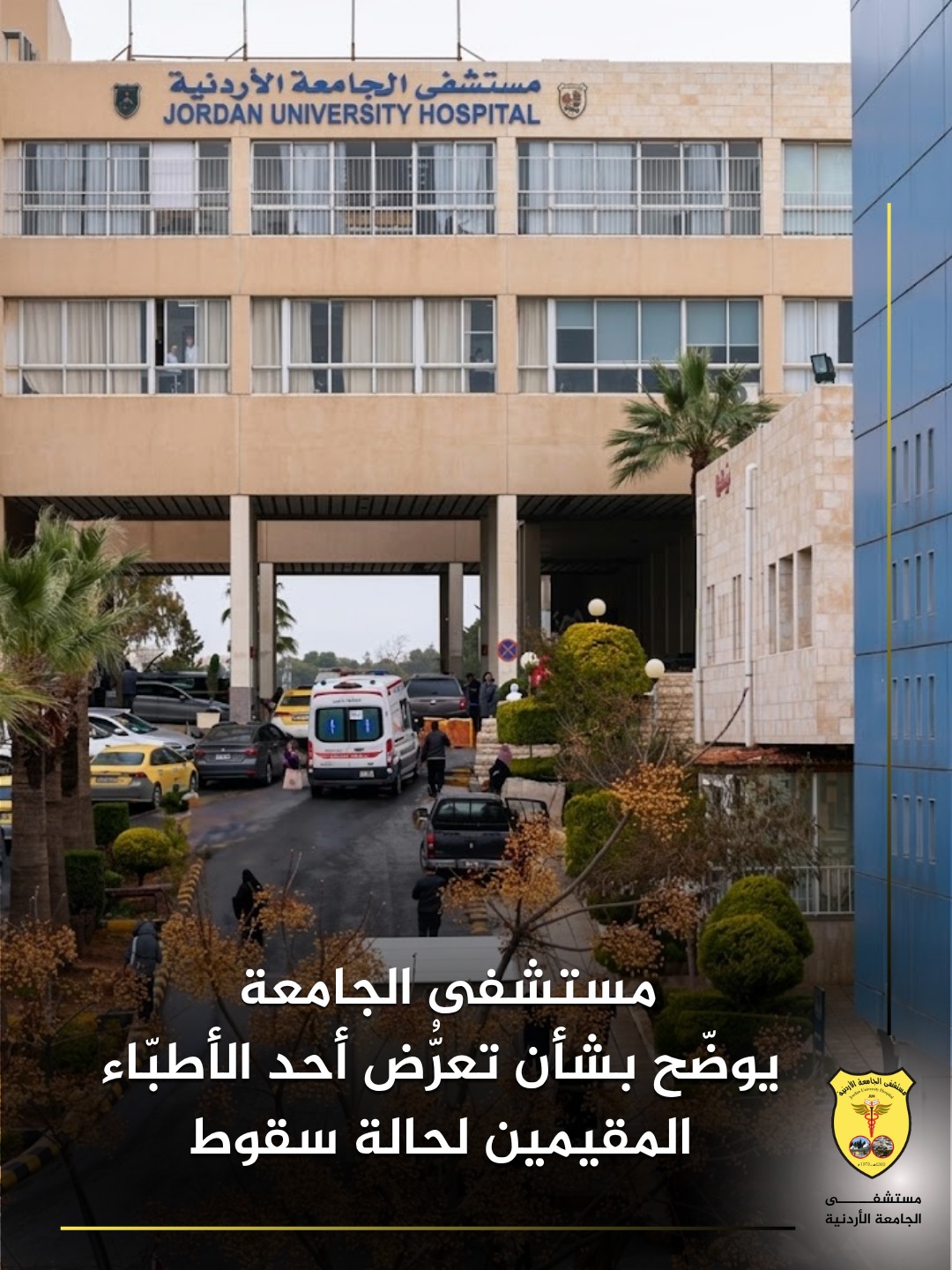 مستشفى الجامعة يوضّح بشأن تعرُّض أحد الأطبّاء المقيمين لحالة سقوط