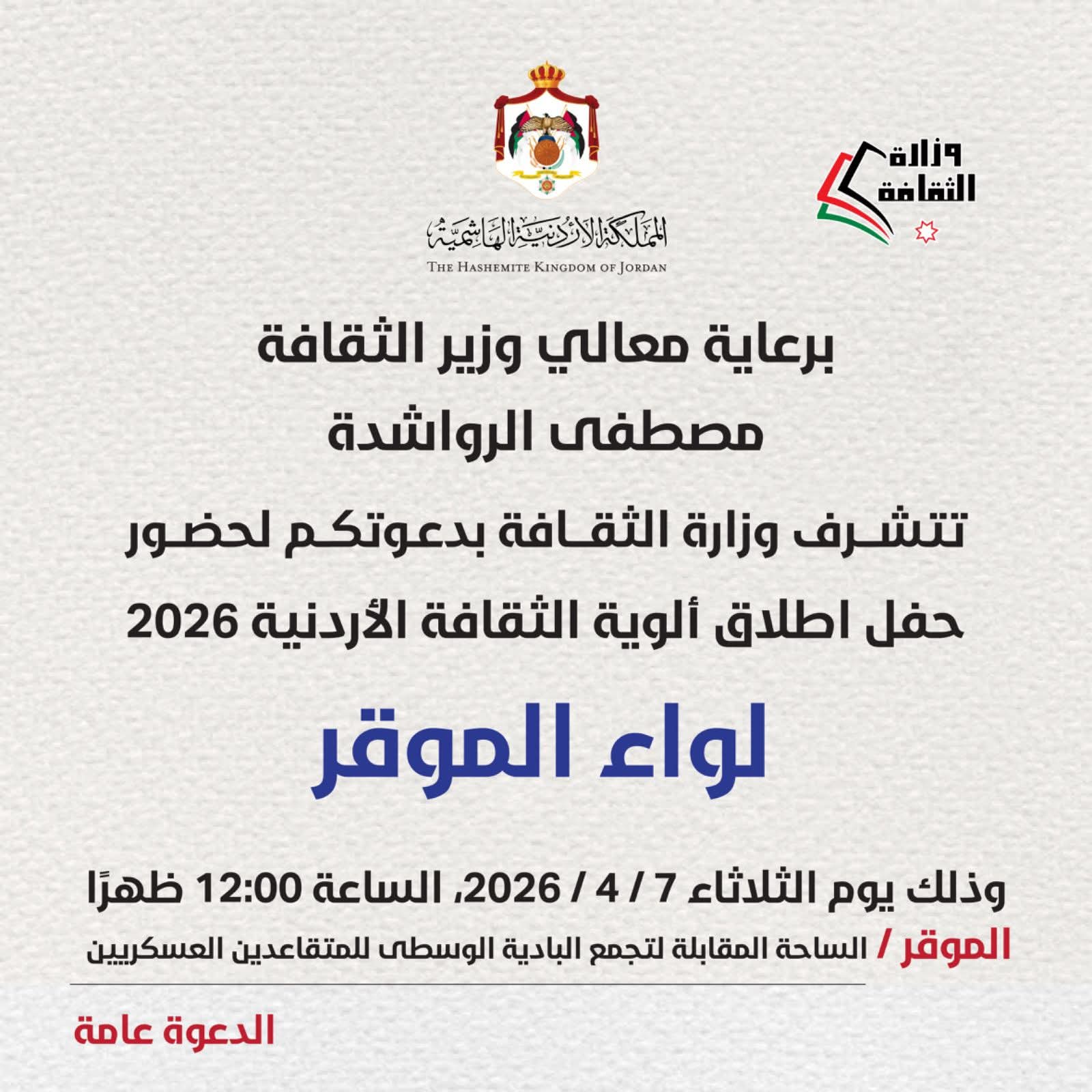 عمون - تحت رعاية وزير الثقافة، مصطفى الرواشدة، تنطلق الأسبوع المقبل من الشهر الجاري فعاليات "ألوية الثقافة الأردنية 2026" بمشاركة واسعة من مختلف الجهات الثقافية والفعاليات الشعبية. |