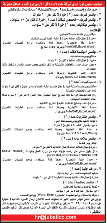 مطلوب مهندسين للعمل لدى شركة مقاولات