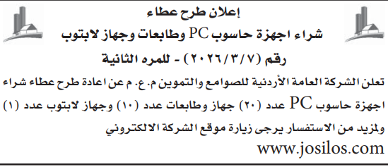 عطاء صادر عن الشركة العامة الاردنية للصوامع والتموين
