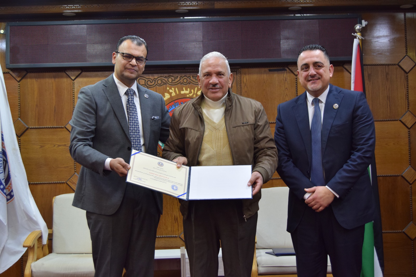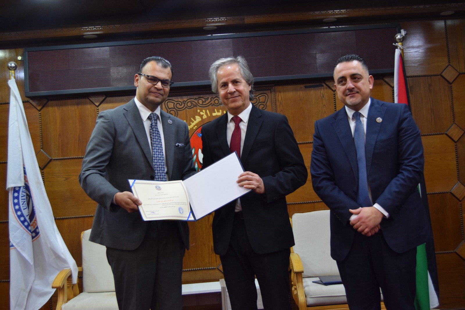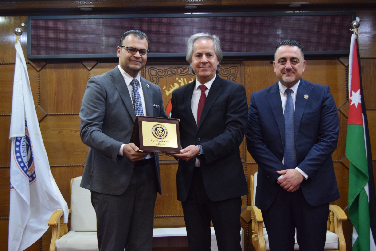 وفي مستهل الحفل، نقل الأستاذ الدكتور محمد مقابلة تحيات الأستاذ الدكتور ماجد أبو زريق رئيس الجامعة، واعتزازه بهذا الإنجاز العلمي النوعي، مؤكدًا أن جامعة إربد الأهلية تنظر إلى البحث العلمي بوصفه ركيزة أساسية في مشروعها الأكاديمي والتنموي، ومحورًا رئيسًا في رؤيتها المؤسسية الهادفة إلى إنتاج المعرفة وخدمة المجتمع.