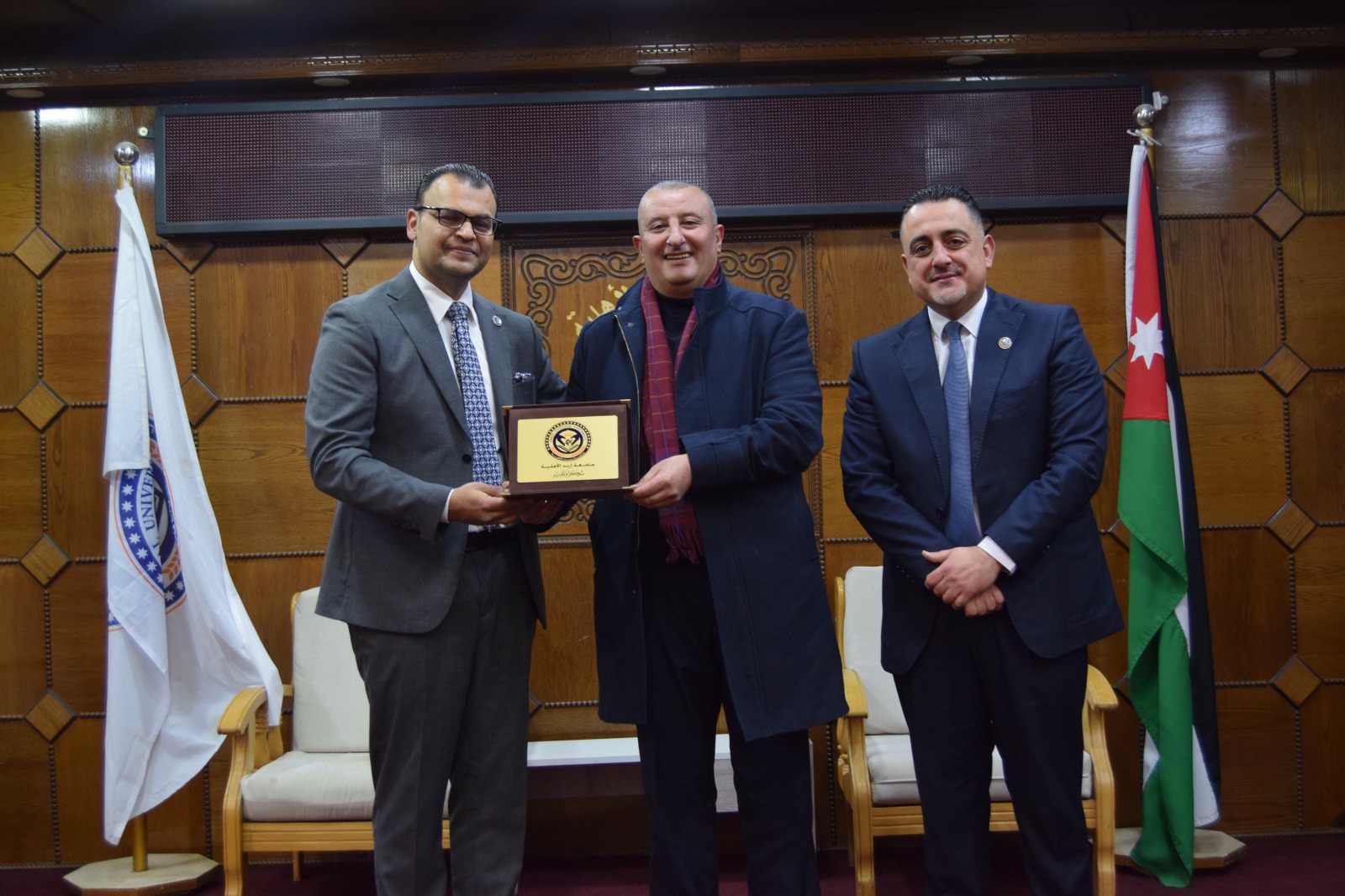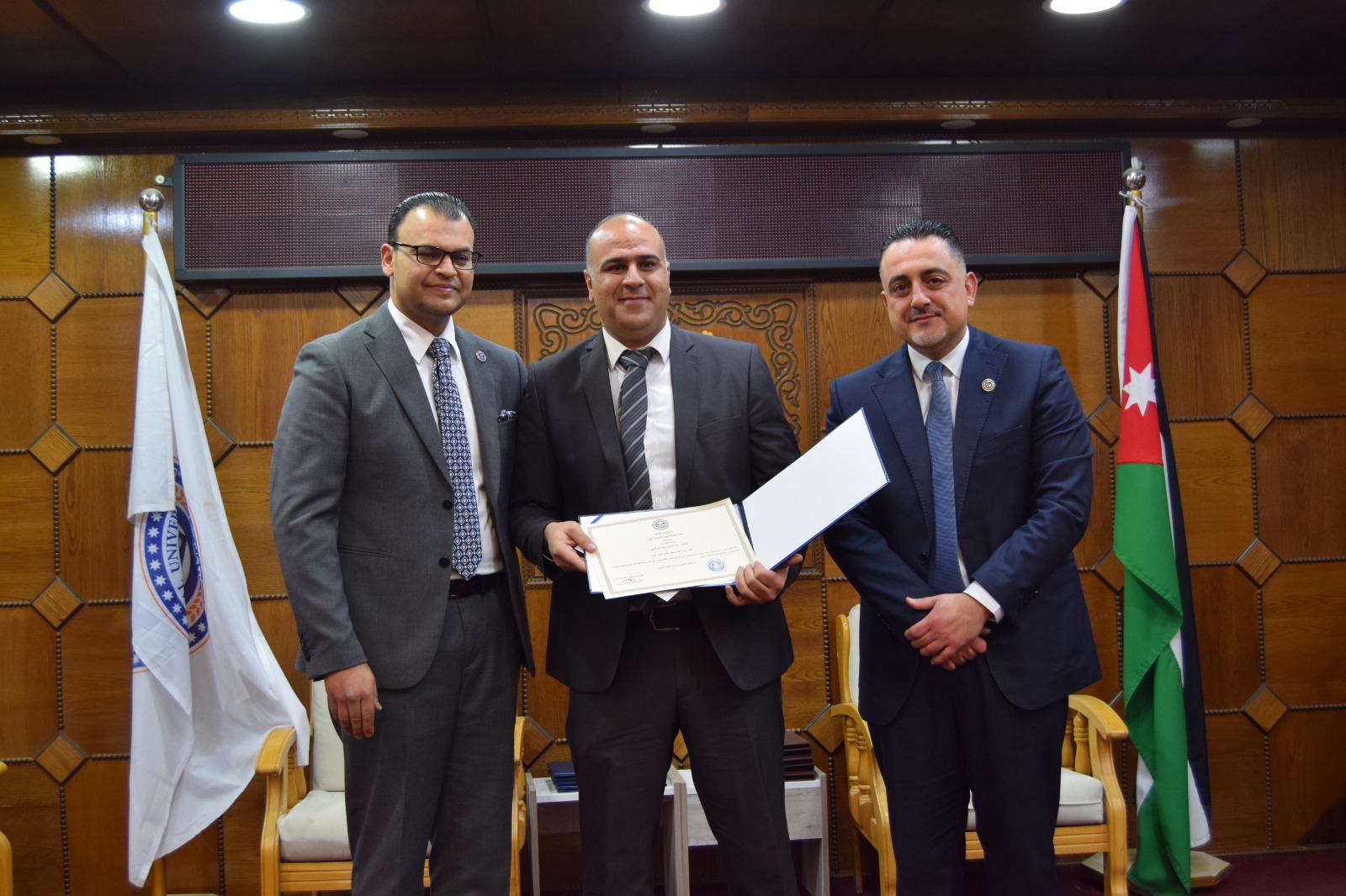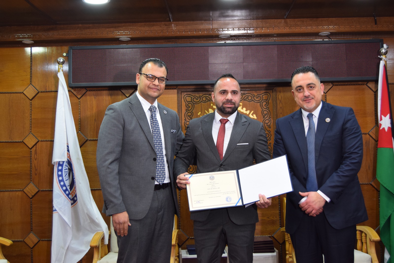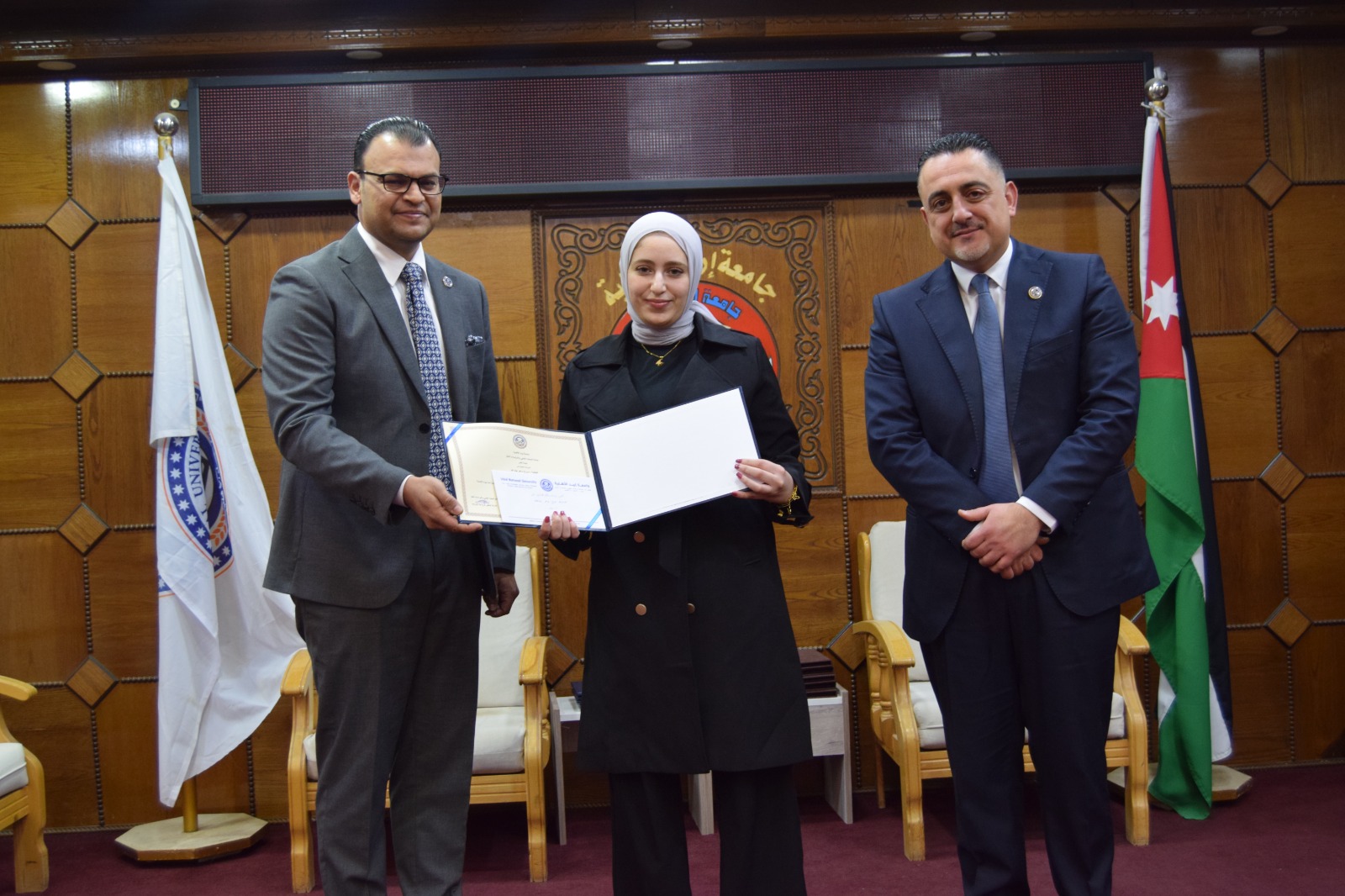 ويُشار إلى أن الحفل استُهل بالسلام الملكي، ثم تلاوة عطرة من آيات الذكر الحكيم قدّمها الطالب أحمد المعلا، كما شهد عرضًا موجزًا لأهم النتائج والتوصيات التي توصلت إليها الرسائل الفائزة، ما أضفى على المناسبة بُعدًا علميًا وتفاعليًا، تلاه حوار أكاديمي بين الطلبة وأعضاء الهيئة التدريسية حول مستقبل البحث العلمي وآفاق تطوير برامج الدراسات العليا في الجامعة.