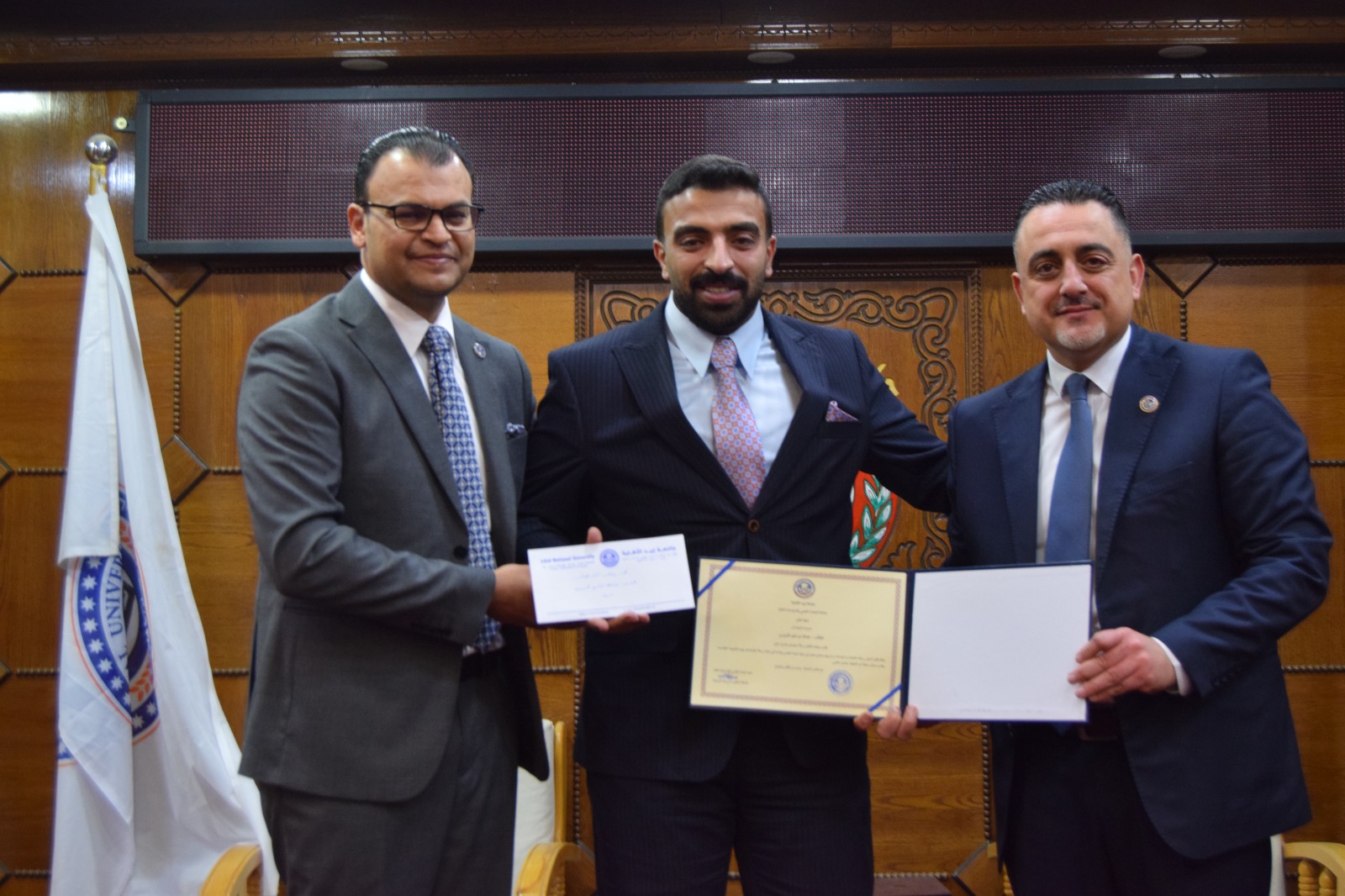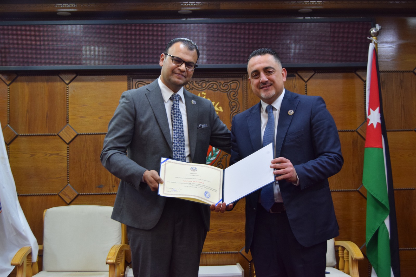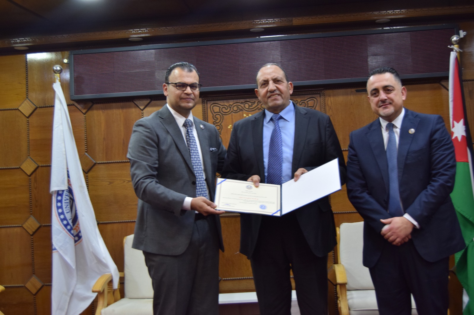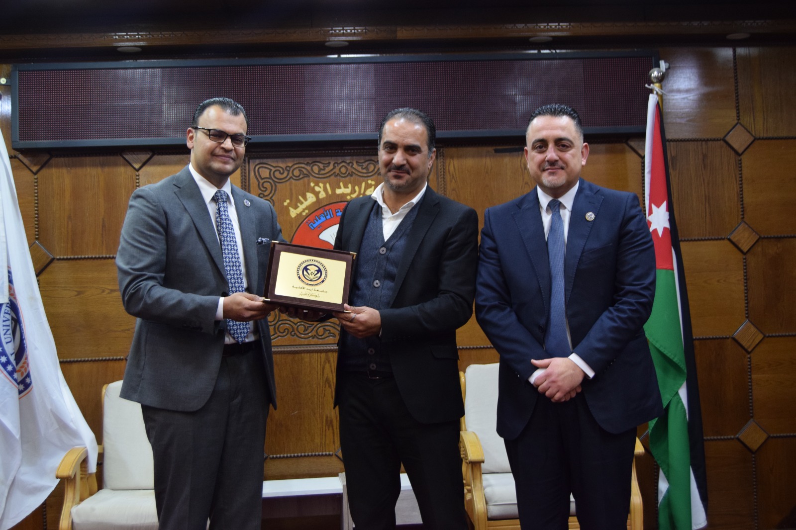ويُشار إلى أن الحفل استُهل بالسلام الملكي، ثم تلاوة عطرة من آيات الذكر الحكيم قدّمها الطالب أحمد المعلا، كما شهد عرضًا موجزًا لأهم النتائج والتوصيات التي توصلت إليها الرسائل الفائزة، ما أضفى على المناسبة بُعدًا علميًا وتفاعليًا، تلاه حوار أكاديمي بين الطلبة وأعضاء الهيئة التدريسية حول مستقبل البحث العلمي وآفاق تطوير برامج الدراسات العليا في الجامعة.