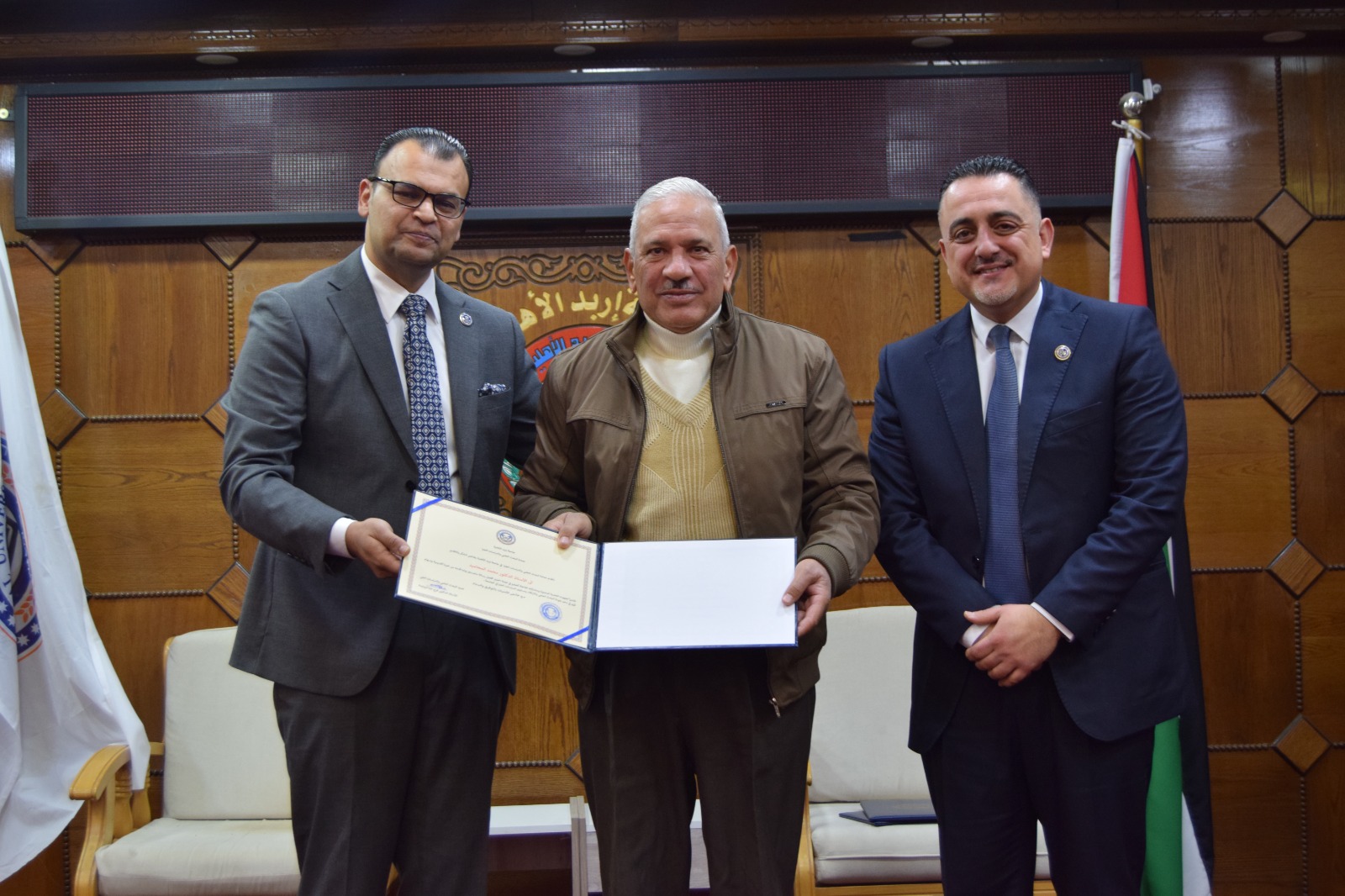 وفي إطار ترسيخ قيم العدالة والنزاهة العلمية، كرّمت الجامعة لجنة تحكيم البحوث المقدمة، التي قامت بجهد علمي دقيق في تقييم الرسائل وفق أسس أكاديمية موضوعية، وضمت اللجنة كلًا من: الأستاذ الدكتور محمد مقابلة، والأستاذ الدكتور فرح الزوايدة، والأستاذ الدكتور أيمن الأحمد، والأستاذ الدكتور محمد المحاميد، والأستاذة الدكتورة نداء المولى.