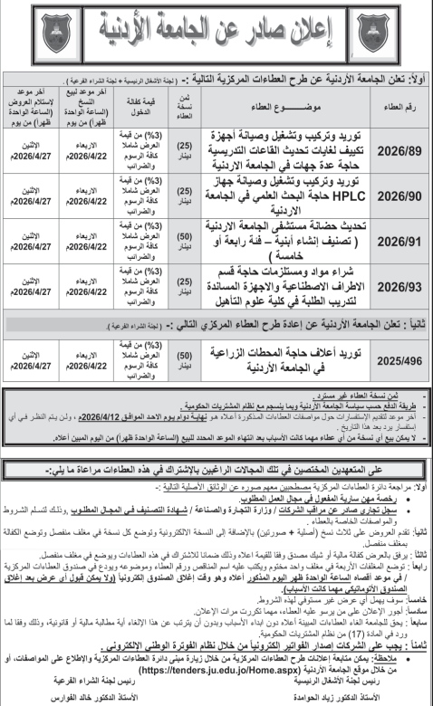 عطاءات صادرة عن الجامعة الاردنية