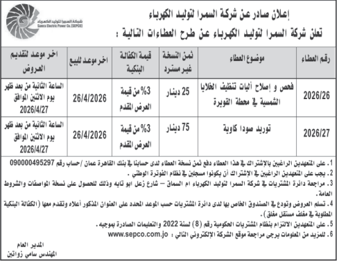 عطاءات صادرة عن شركة السمرا لتوليد الكهرباء