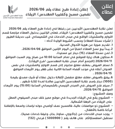 عطاء صادر عن نقابة المهندسين الاردنيين
