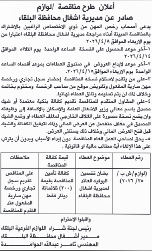 عطاء تضمين كافتيريا مديرية اشغال البلقاء