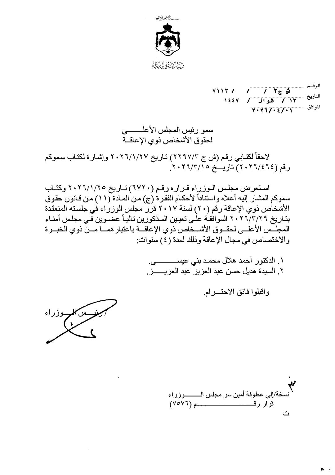 عمون - قرر مجلس الوزراء في جلسته التي عقدها يوم 29 آذار 2026 ، الموافقة على تنسيب رئيس المجلس الأعلى لحقوق الأشخاص ذوي الإعاقة سمو الامير مرعد بن رعد بن زيد، بتعيين الدكتور أحمد هلال بني عيسى وهديل حسن عبدالعزيز عضوين في مجلس أمناء المجلس. |
