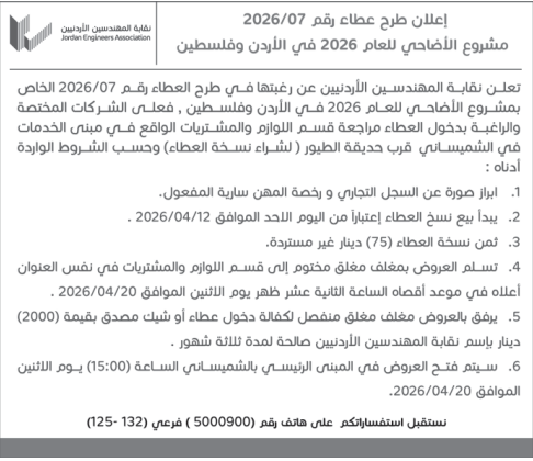 عطاء صادر عن نقابة المهندسين الاردنيين