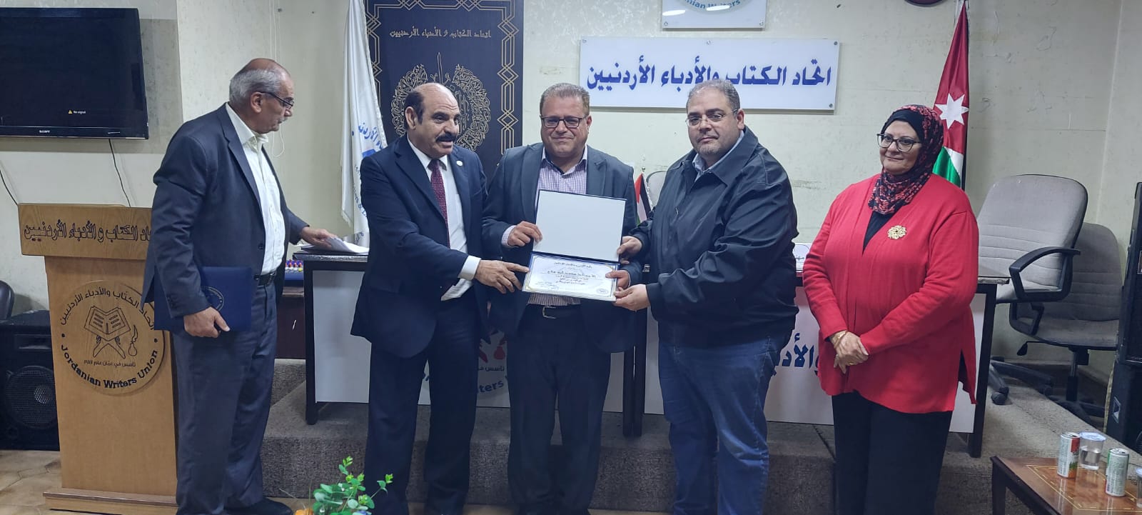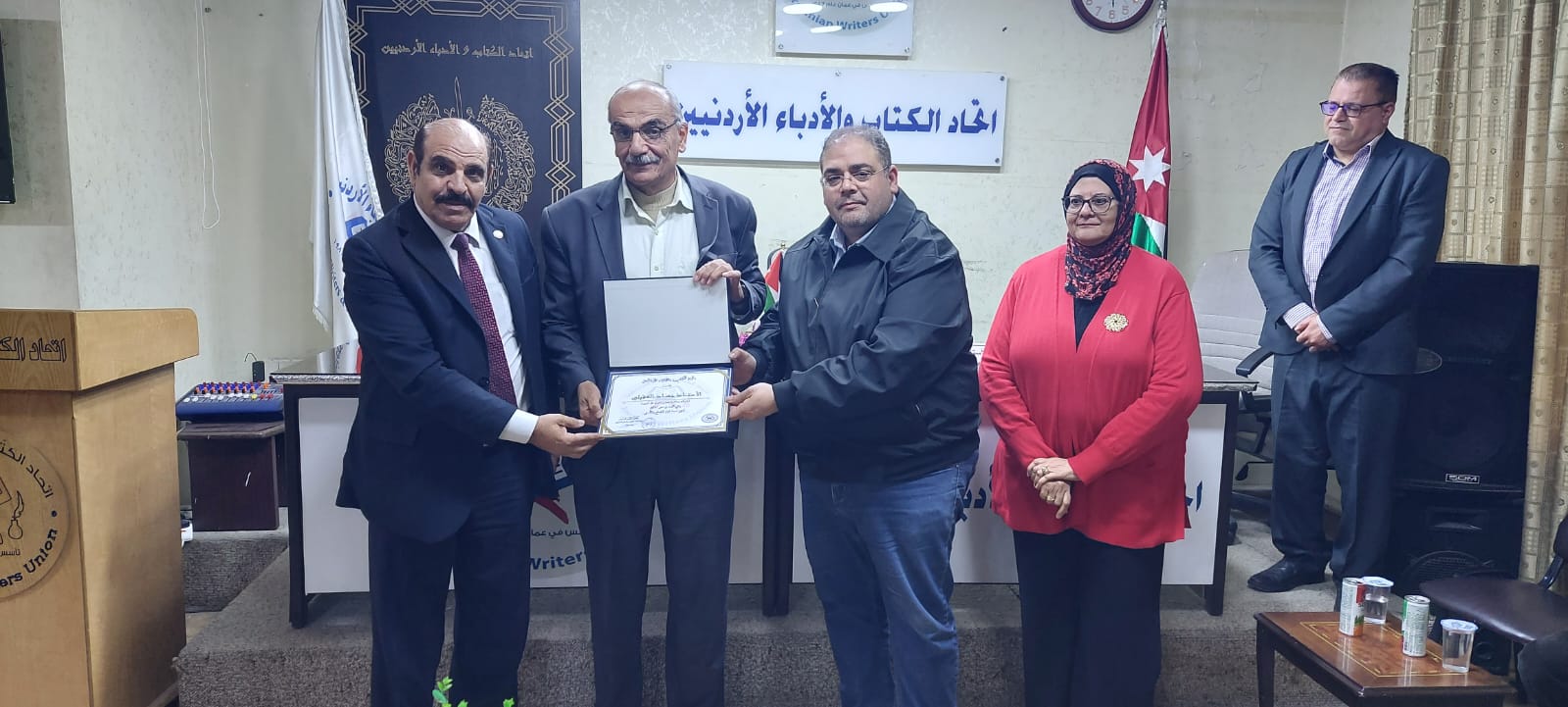 وفي نهاية المحاضرة تم الاجابة على اسئلة الحضور/وتفضل رئيس الاتحاد العدوان بتكريم المحاضر العقيلي ومقدم المحاضرة الكاتب مهند ابو فلاح بشهادتي تكريم وتم التقاط الصور التذكارية لهذه المحاضرة