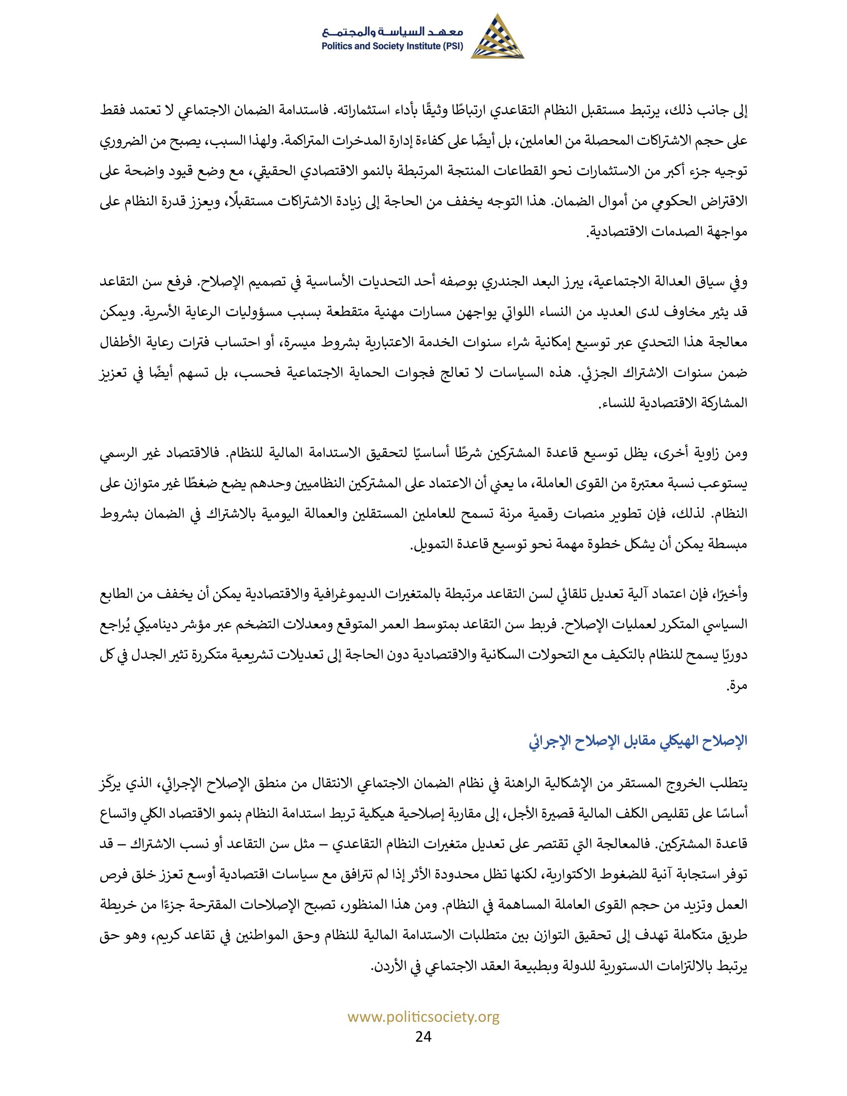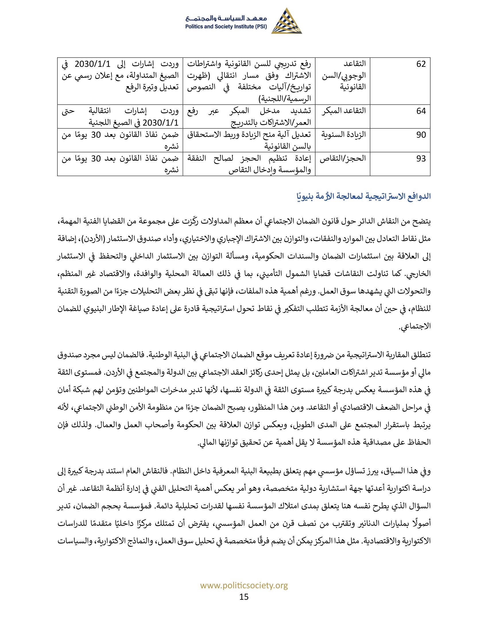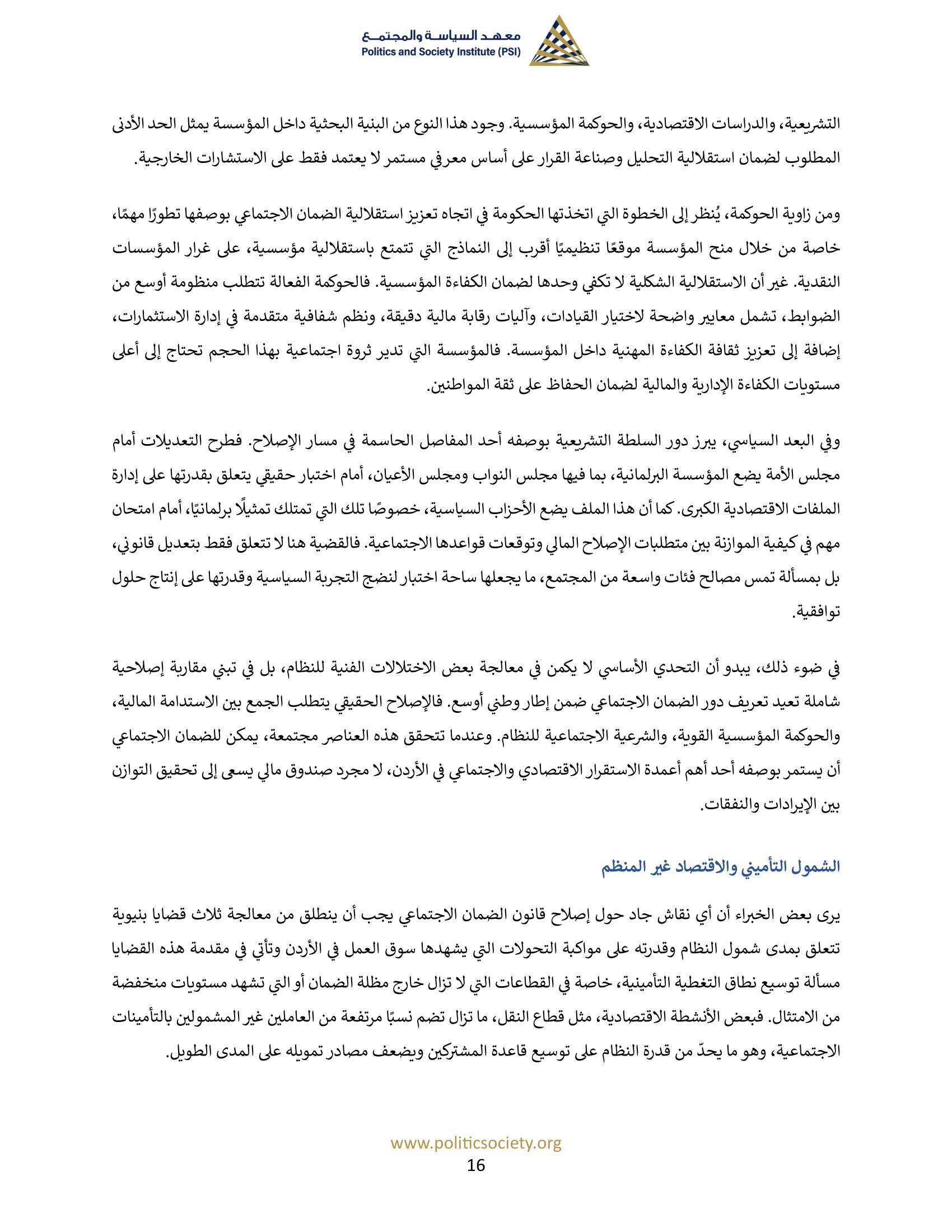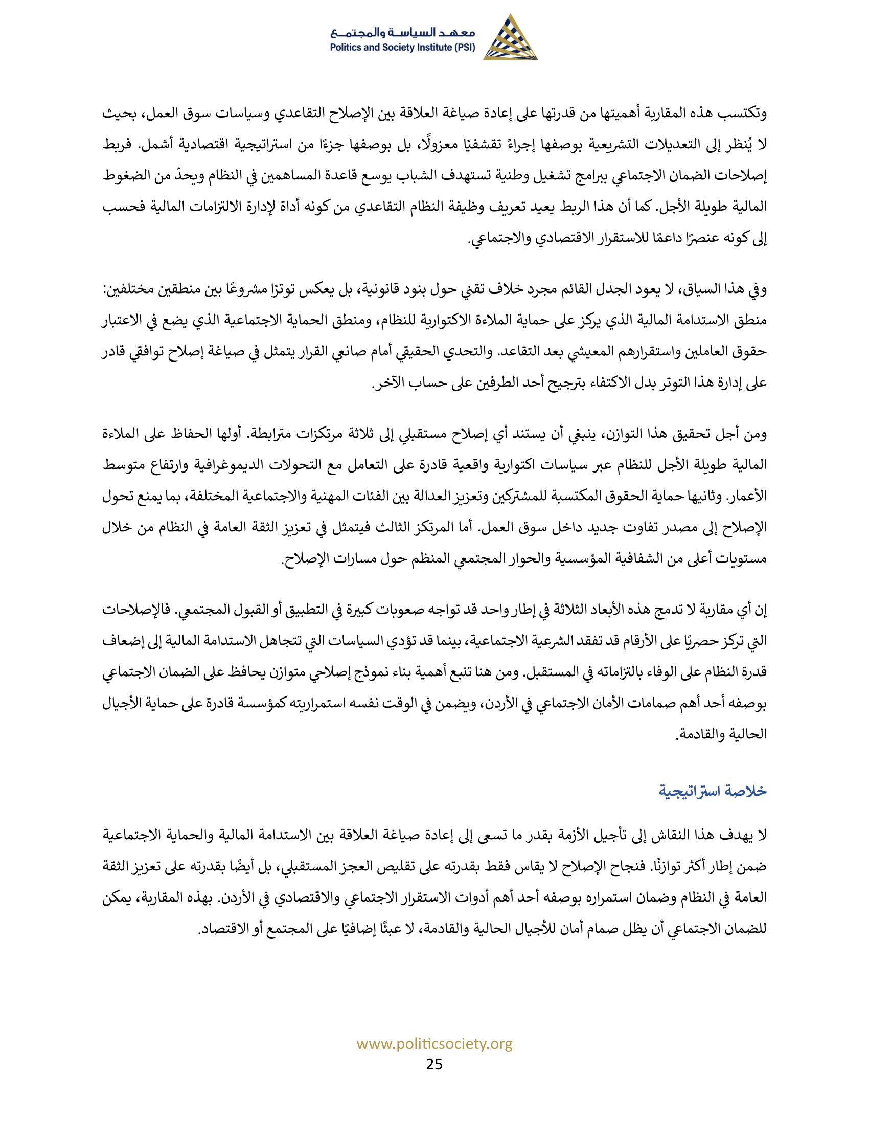ويؤكد التقرير أن إصلاح الضمان الاجتماعي يجب أن يُنظر إليه بوصفه قضية وطنية استراتيجية تتطلب توافقًا وطنيًا ورؤية طويلة الأجل، بما يعزّز دوره كأحد أعمدة الاستقرار الاقتصادي والاجتماعي في الأردن.
